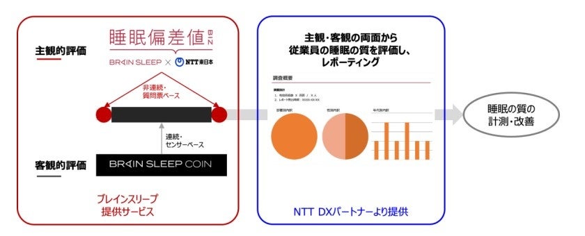 NTT DXパートナーは、公認代理店として2022年6月より取り扱いを開始している健康経営支援サービス「睡眠偏差値 for Biz」について、サービスの価値を向上させるために、新たに睡眠計測アプリ・デバイス「ブレインスリープ コイン」を活用したオプションサービスの取り扱いを開始することといたしました。これにより、従来の質問票の回答結果による主観的な観点に加え、「ブレインスリープ コイン」によって計測した睡眠ステージ等の睡眠日次データ※6による客観的な観点で、企業に所属する従業員の睡眠の質をより高精度に可視化することができるようになります。