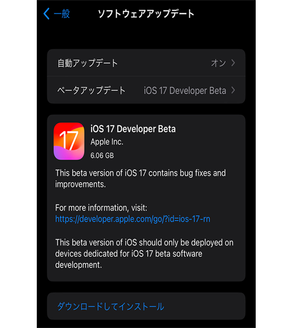 Step1:「設定」―「一般」―「ソフトウェアアップデート」のベータアップデートをタップすると、「iOS17 Developer Beta」が選択可能になっています。そこからダウンロードを開始してください。