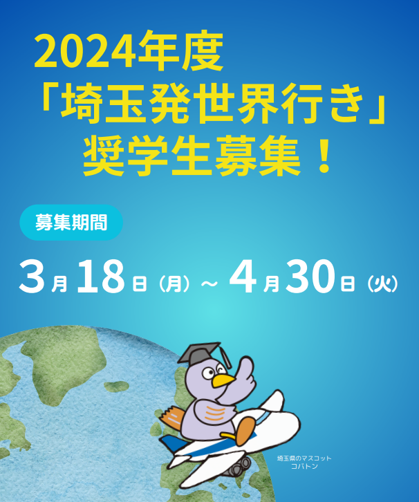 このたび、返済不要の給付型奨学金である「埼玉発世界行き」奨学金の令和6年度奨学生を募集します(運営は(公財)埼玉県国際交流協会)。
