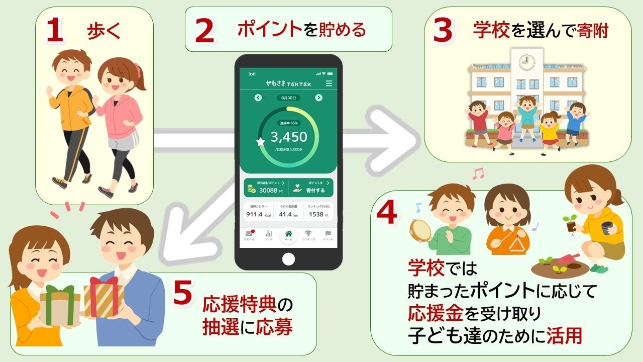 参加者は、歩いてアプリ内で貯めたポイントを応援したい川崎市立の小・中学校(特別支援学校を含む)から選んで寄附します。さらに、寄附したポイントに応じて付与されるチケットで、川崎フロンターレや川崎ブレイブサンダース、協賛企業等からの応援特典の抽選に応募することができます。また、学校では寄附されたポイント数に応じた応援金を市から受け取り、子ども達の学校生活を充実させるために活用します。