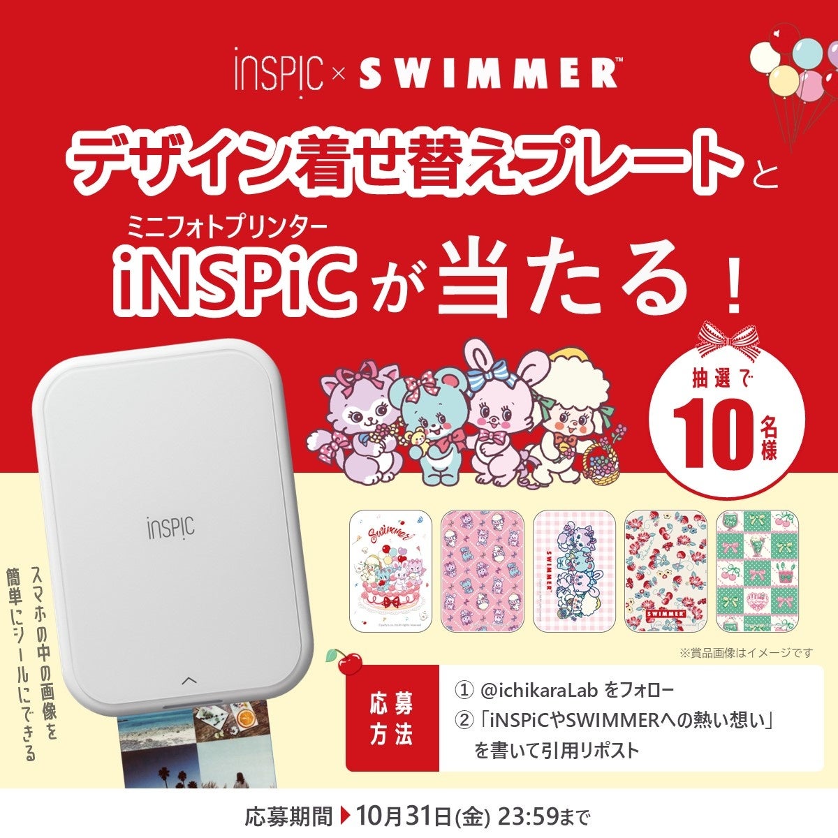 「iNSPiC」はスマホとBluetoothで簡単接続、スマホのなかの画像をシールにできる手のひらサイズのフォトプリンター。別売りのプレートでプリンターを”着せ替え”が可能です。本コラボレーションでは、「iNSPiC PV-223」本体と着せ替えプレートが当たるキャンペーンを実施します!「iNSPiC」専用アプリでは、期間限定でSWIMMERデザインのスタンプやフレーム第一弾を公開中!第二弾も公開予定ですのでお楽しみに。