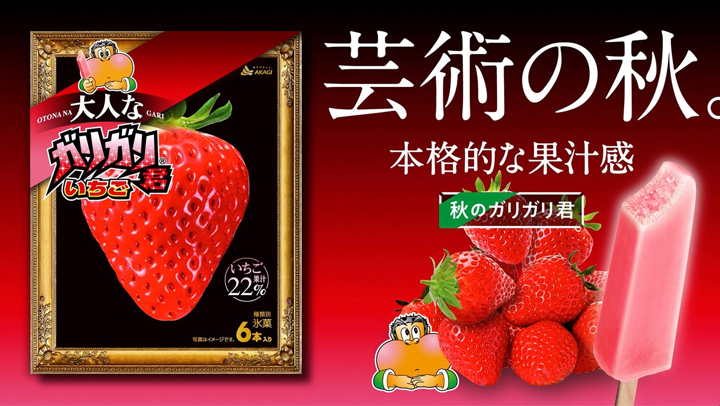 「大人なガリガリ君いちご」は、いちごアイスの中に、ガリガリ食感のジューシーないちごかき氷を入れたアイスキャンディーです。芸術の秋をテーマに、パッケージの表面は美味しそうな苺の写真を惜しみなく前面に出し、金色の額縁に飾った、まるで写真展に来ているかのような気分になれるデザインに仕上げました。