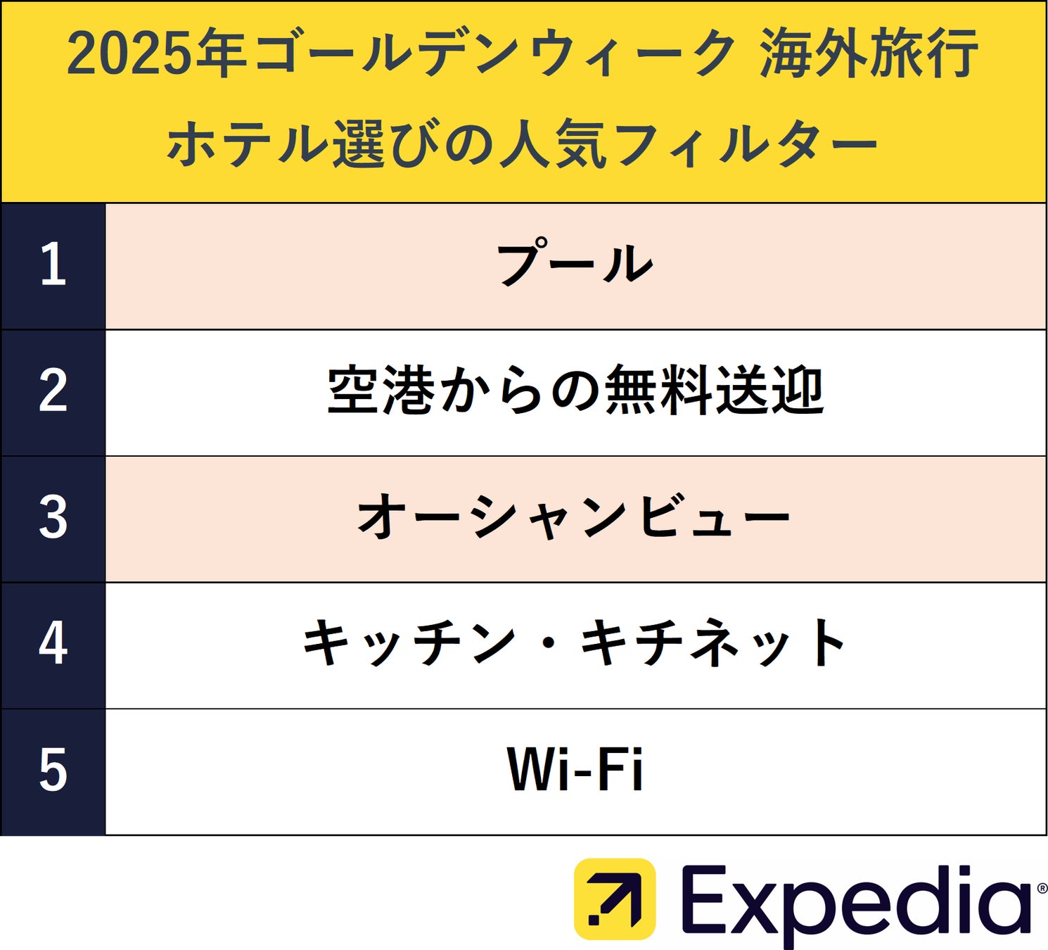 エクスペディアでは、「プール」「ジム」「駐車場」など、希望する設備やサービスの有無をフィルター機能で調べた上でホテルを選ぶことができます。今年のゴールデンウィークの海外旅行のホテルを検索しているユーザーが最も多く使っていたフィルター※1 1位は「プール」、3位には「オーシャンビュー」と、ゴールデンウィーク中に夏を先取りしたウォーターアクティビティを希望している人が多いことが伺えます。