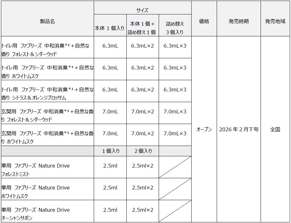 「ファブリーズ 中和消臭*¹+自然な香り」は、トイレ用と玄関用の2タイプを展開します。トイレ用は「フォレスト&シダーウッド」「ホワイトムスク」「シトラス&オレンジブロッサム」の3つの香りをラインアップ。玄関用は「フォレスト&シダーウッド」「ホワイトムスク」の2つの香りで展開します。また、車用からは、自然な香りを楽しめる「車用 ファブリーズ Nature Drive」シリーズとして、「フォレストミスト」「ホワイトムスク」「オーシャンサボン」の3種類を発売します。