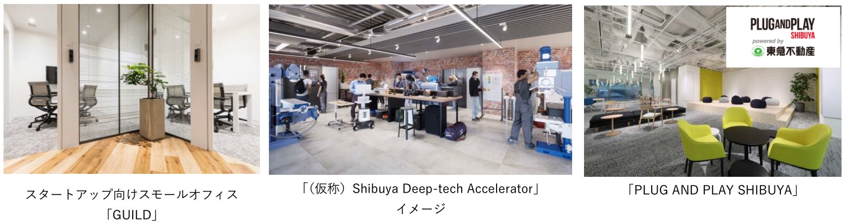 スタートアップ向けスモールオフィス「GUILD」の展開や、マサチューセッツ工科大学(MIT)の産学連携プログラム (MIT ILP)との協業による、渋谷最大級のイノベーション創出の場、「(仮称)Shibuya Deep-tech Accelerator」の開設