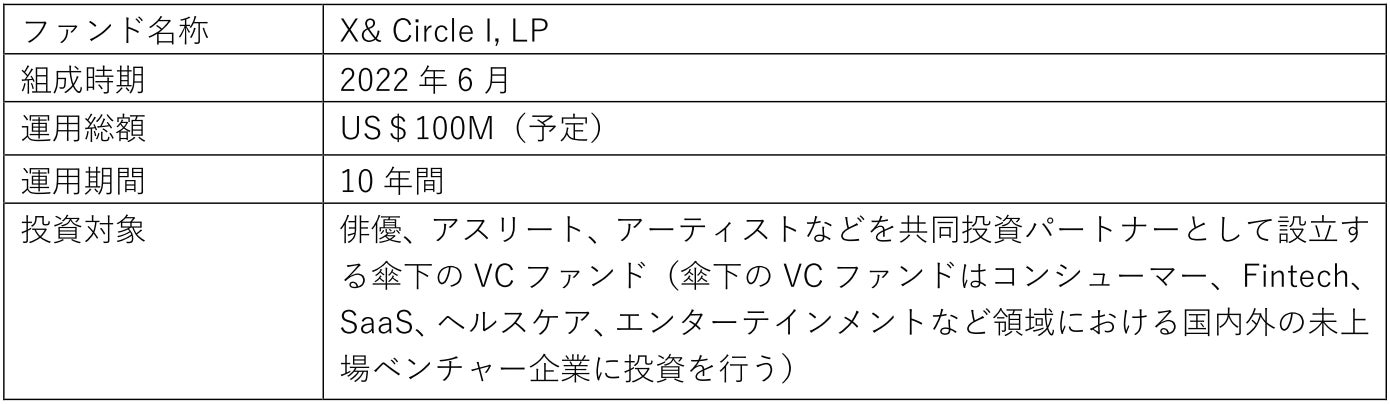 海外の著名人を対象に、本田圭佑氏らが自身の投資ファンドを立ち上げる際のLP出資に特化したファンドであり、米国のトップ案件に投資を続ける中で構築されたグローバルなイノベーションコミュニティへのアクセスを日本の企業・政府に還元していくことで、日本企業の真のオープンイノベーション実現の支援ならびに世界的に影響力のあるリーダーたちの事業・投資先を組み合わせることを目的としています。