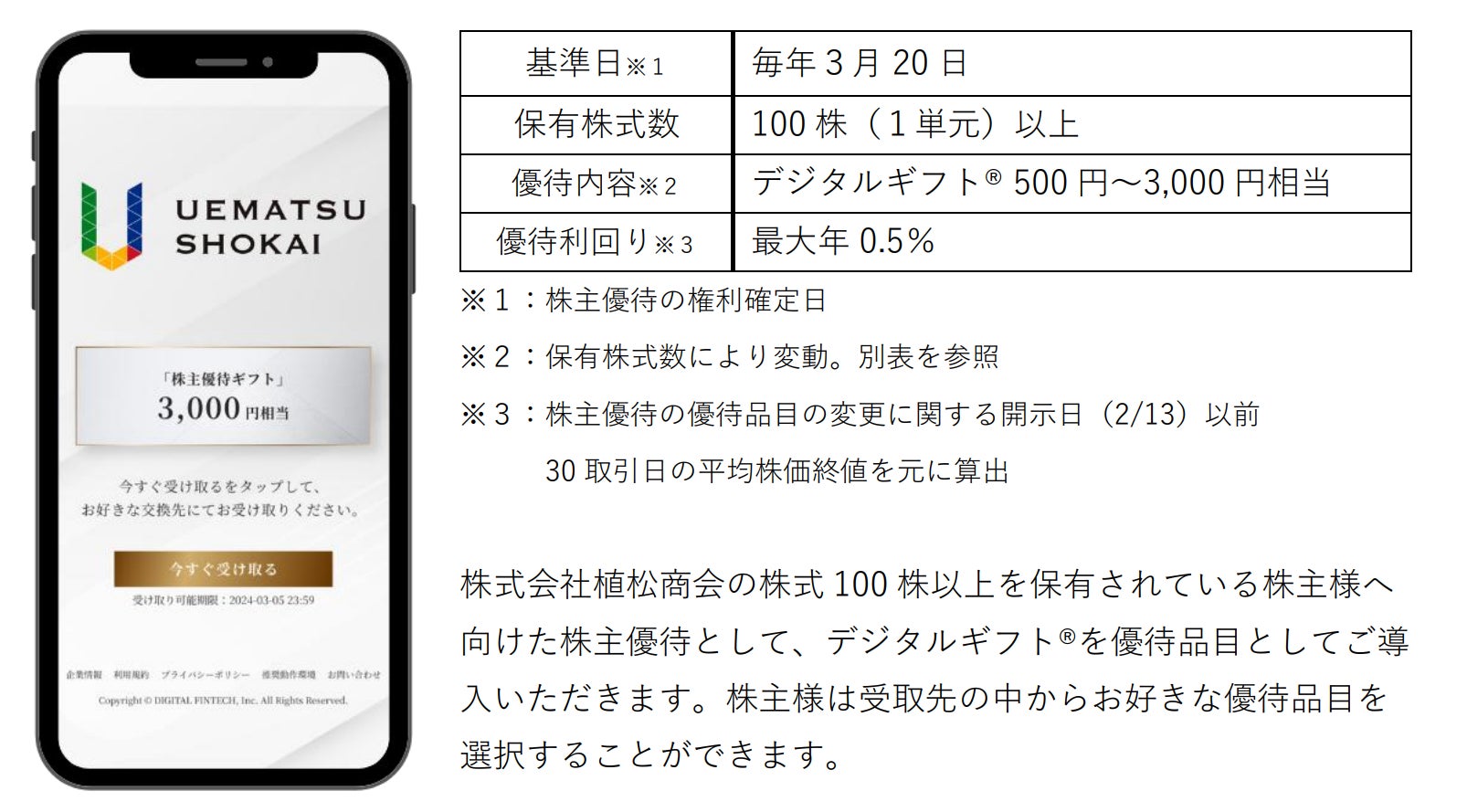 株式会社植松商会(代表取締役社長:植松 誠一郎、東証スタンダード・名証メイン:証券コード 9914)において、株式会社デジタルプラス(代表取締役社長:菊池 誠晃、本社:東京都渋谷区、東証グロース市場:証券コード3691)グループが運営する「デジタルギフト®」を株主優待としてご活用いただくことになりました。