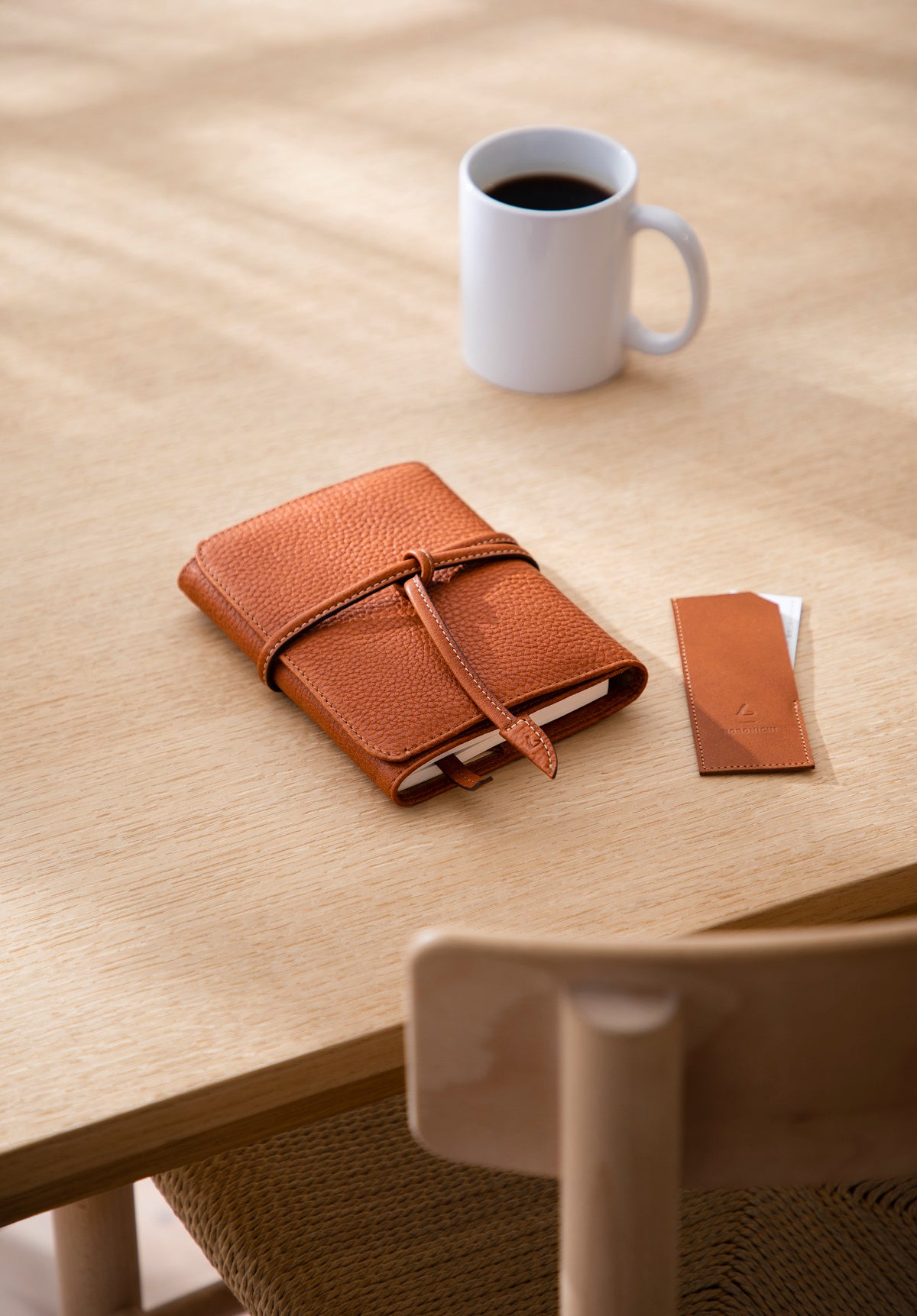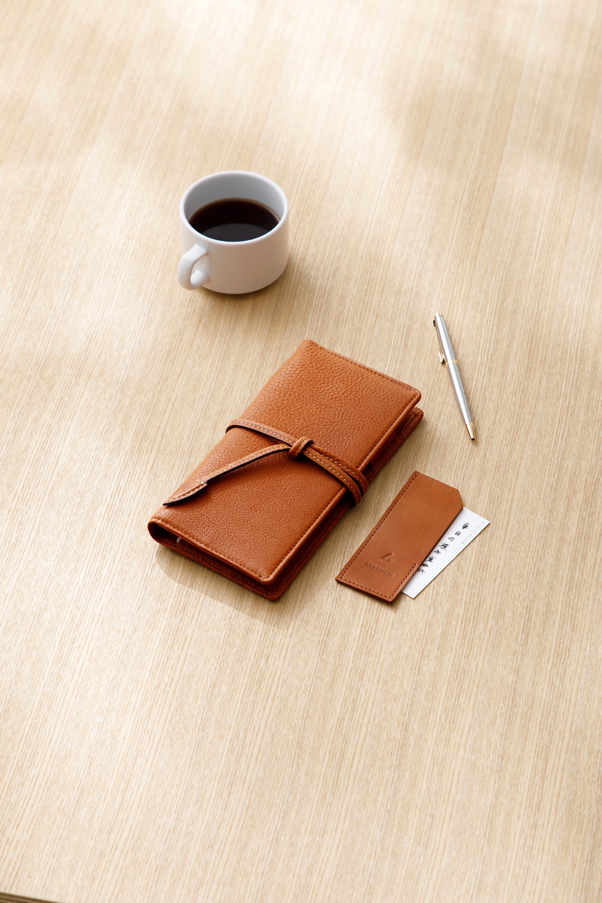 機能面では、カードやステーショナリーを収納できる使い勝手の良さはもちろん、巻いたり解いたりする所作が楽しい革紐や、ショップカードなどの日々の思い出を仕舞えるポケットなども兼備。手帳を使う時間が楽しくなり、愛着が増していくデザインとなっています。