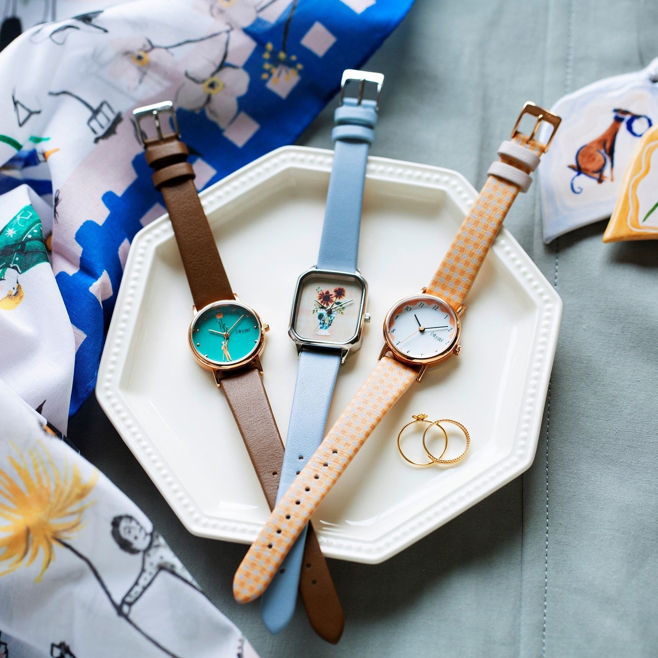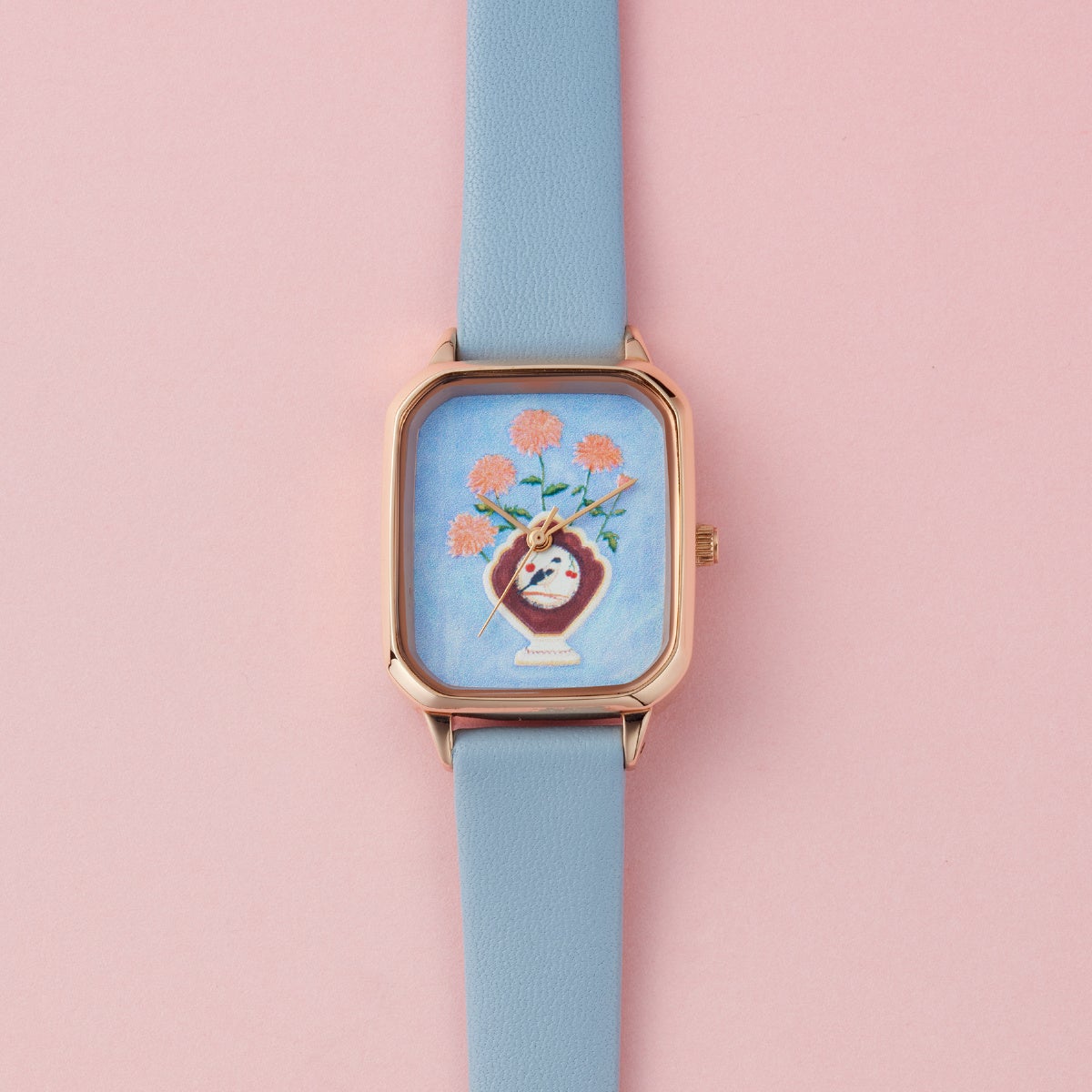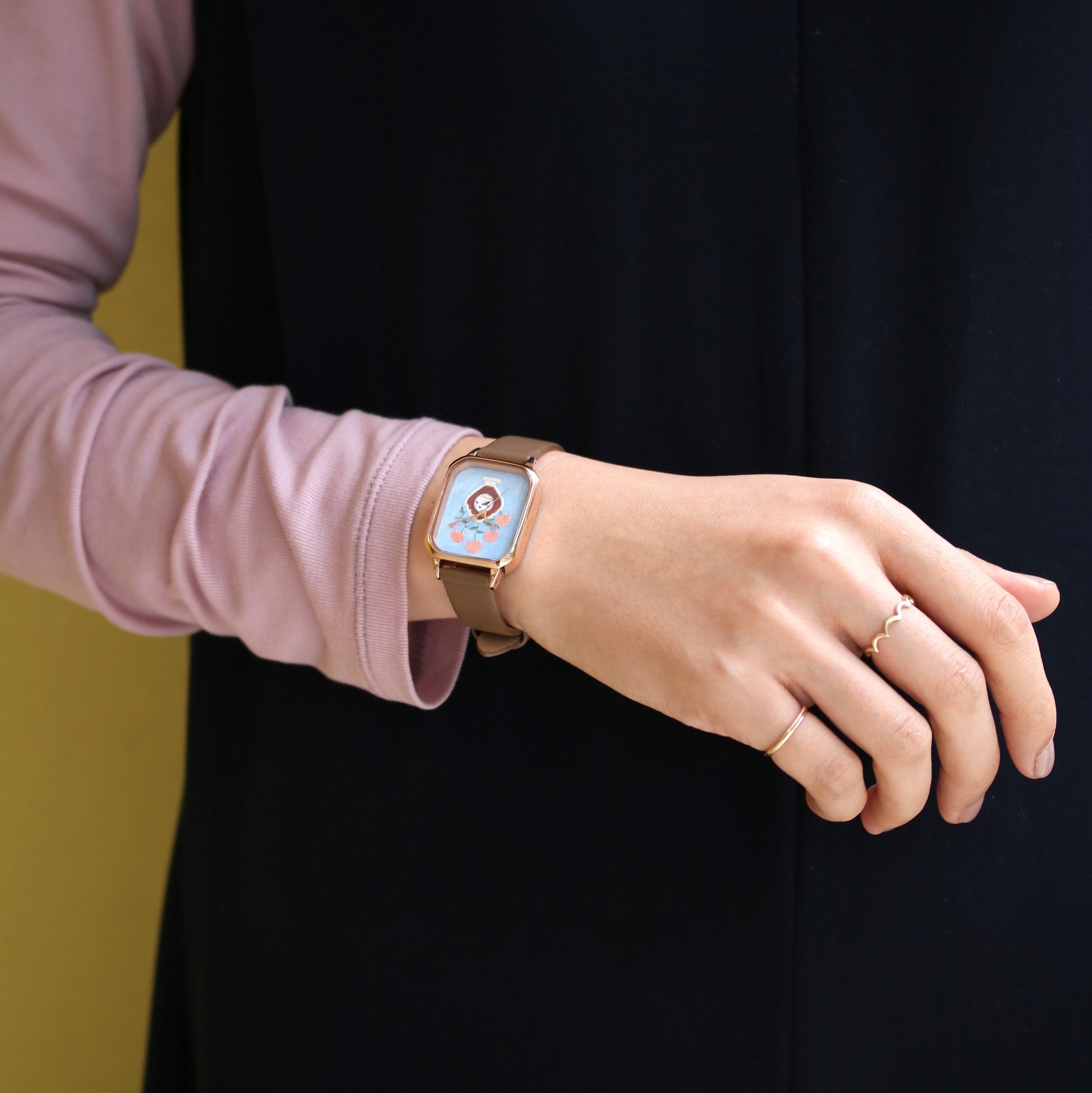 花や動物をモチーフとした、自然を感じさせるやさしい色使いの作品。その独特の世界観をダイヤルに閉じ込めた、時間を見るたび心躍るアートな腕時計です。