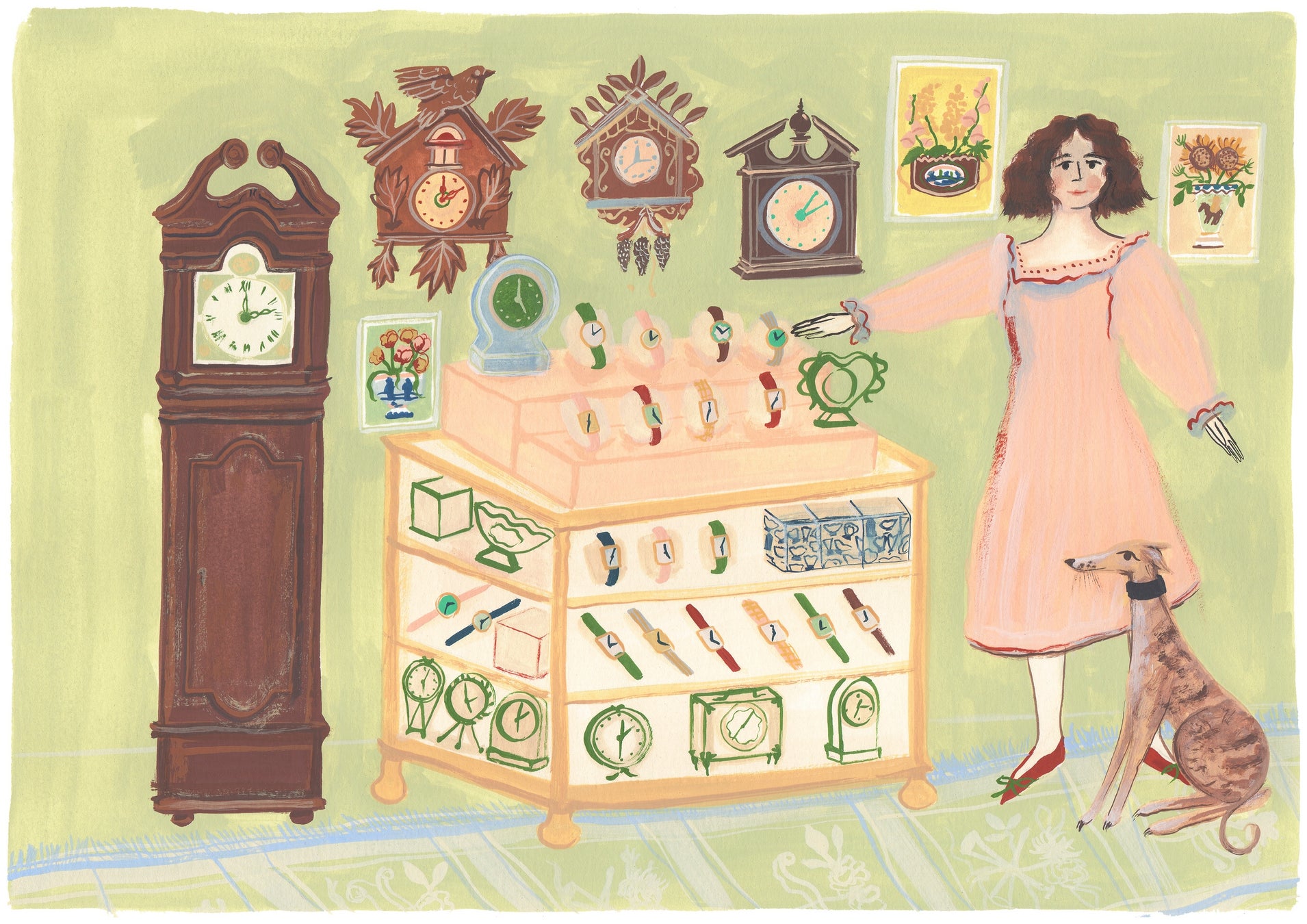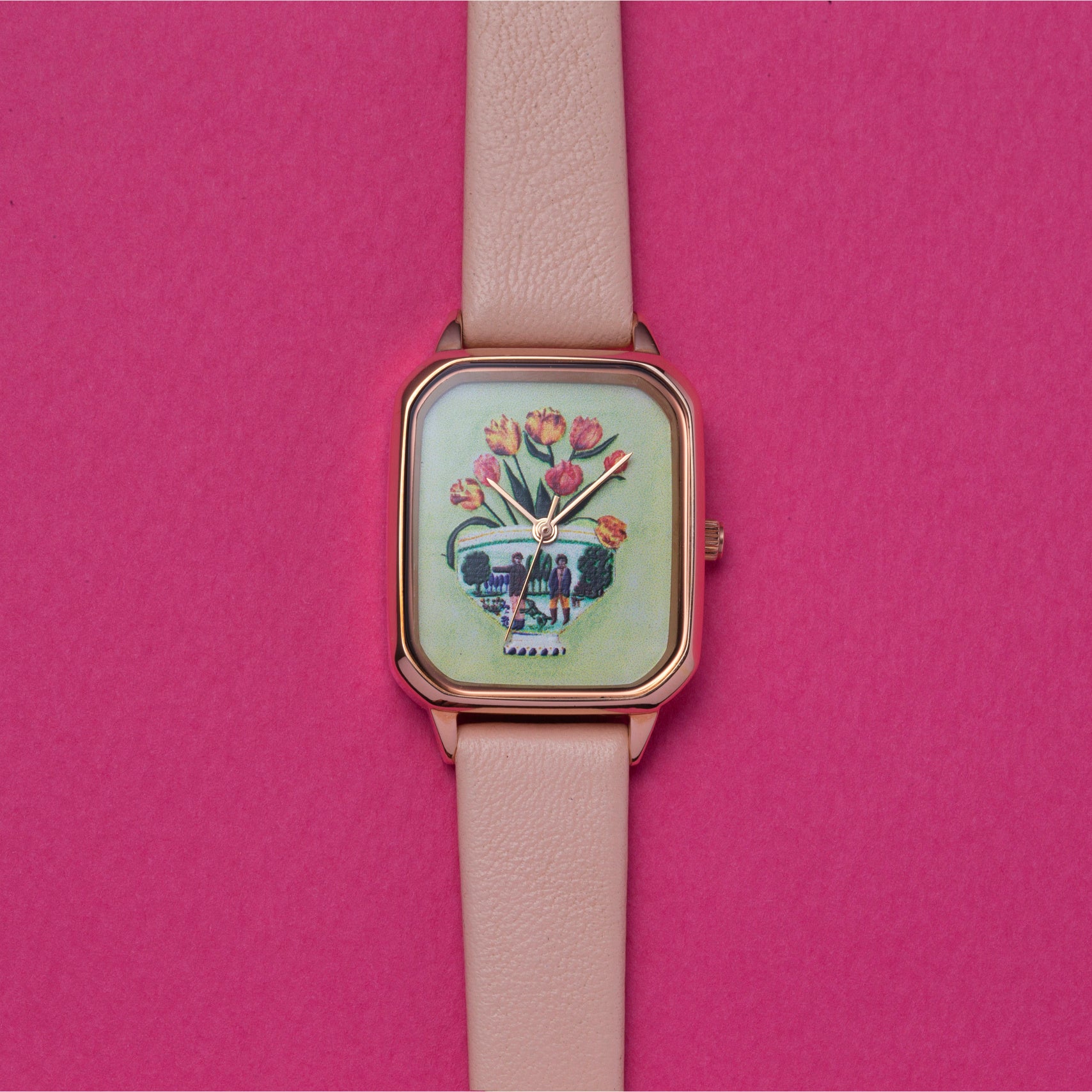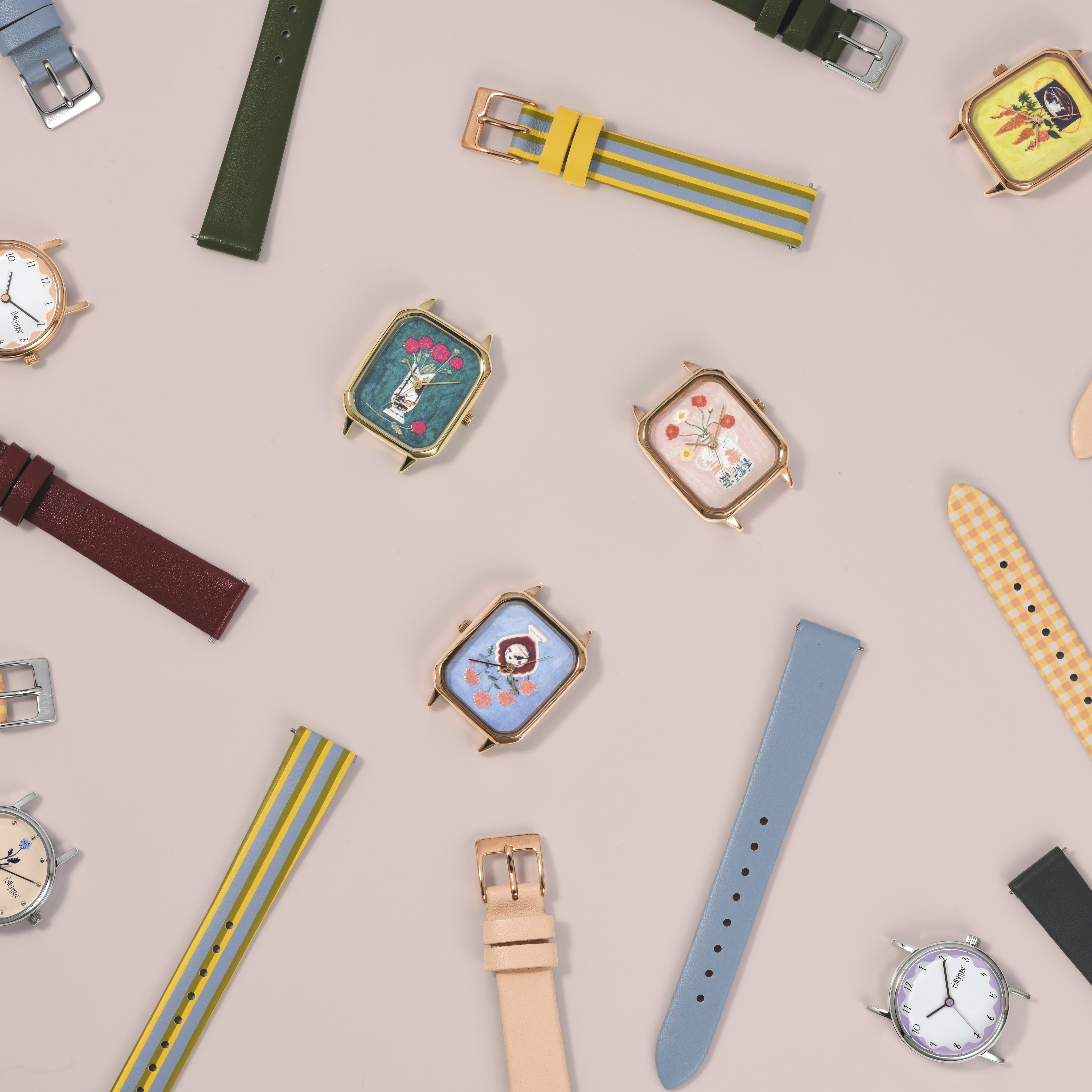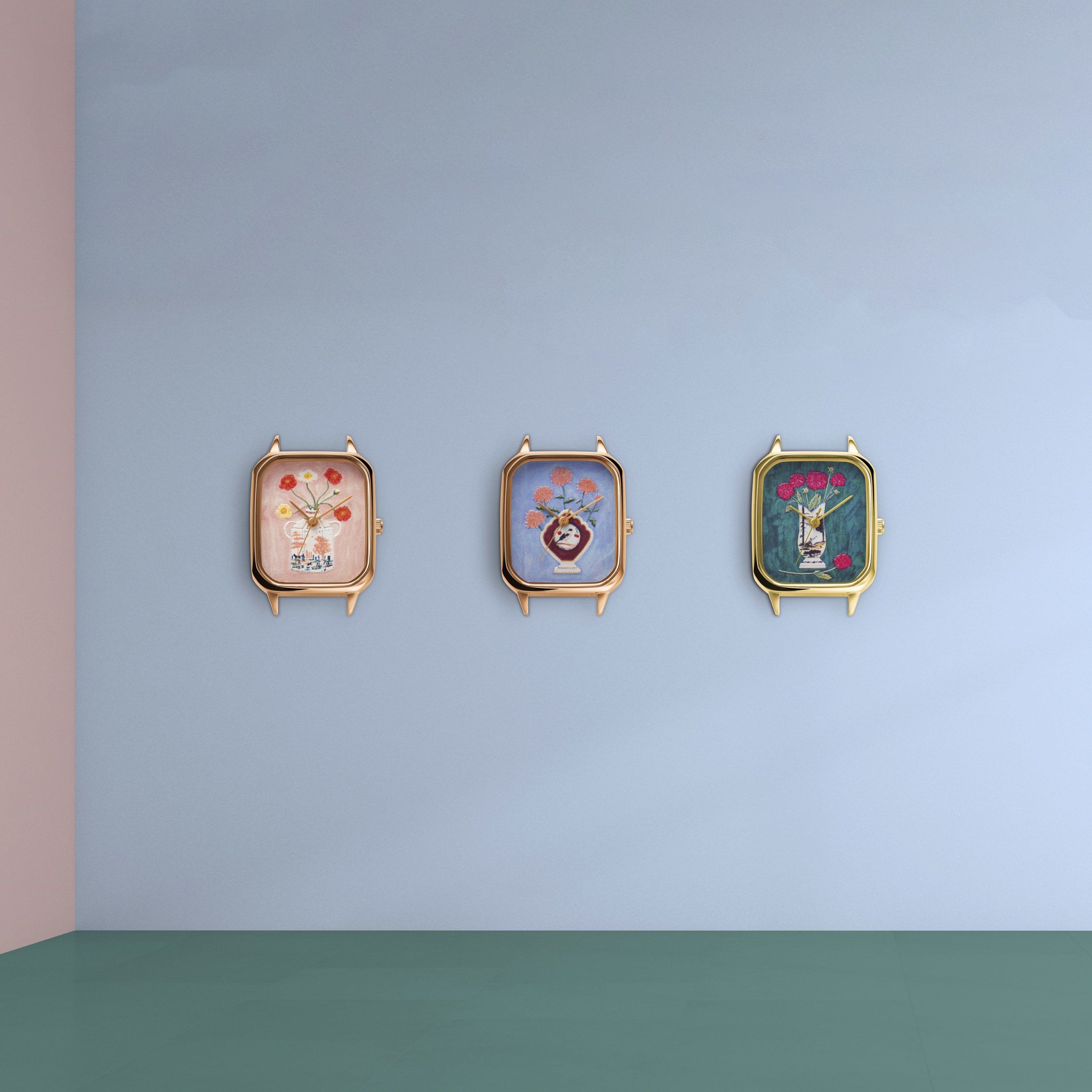 花や動物をモチーフとした、自然を感じさせるやさしい色使いの作品。その独特の世界観をダイヤルに閉じ込めた、時間を見るたび心躍るアートな腕時計です。