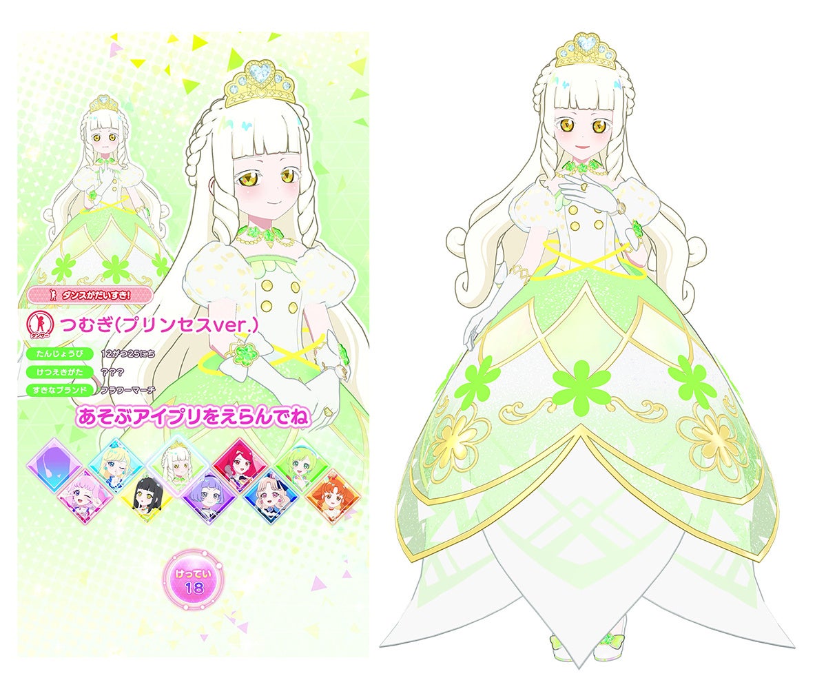 11月24日(日)放送のアニメで「つむぎ」がプリンセスの姿になった展開に合わせて、「プリンセスアイプリ」の姿の「つむぎ」がキャラクターとして新たに登場し、ライブゲームが楽しめるようになります。また、「つむぎ」の「フラワーマーチプリンセスバズリウム」のコーデがラインアップされます。