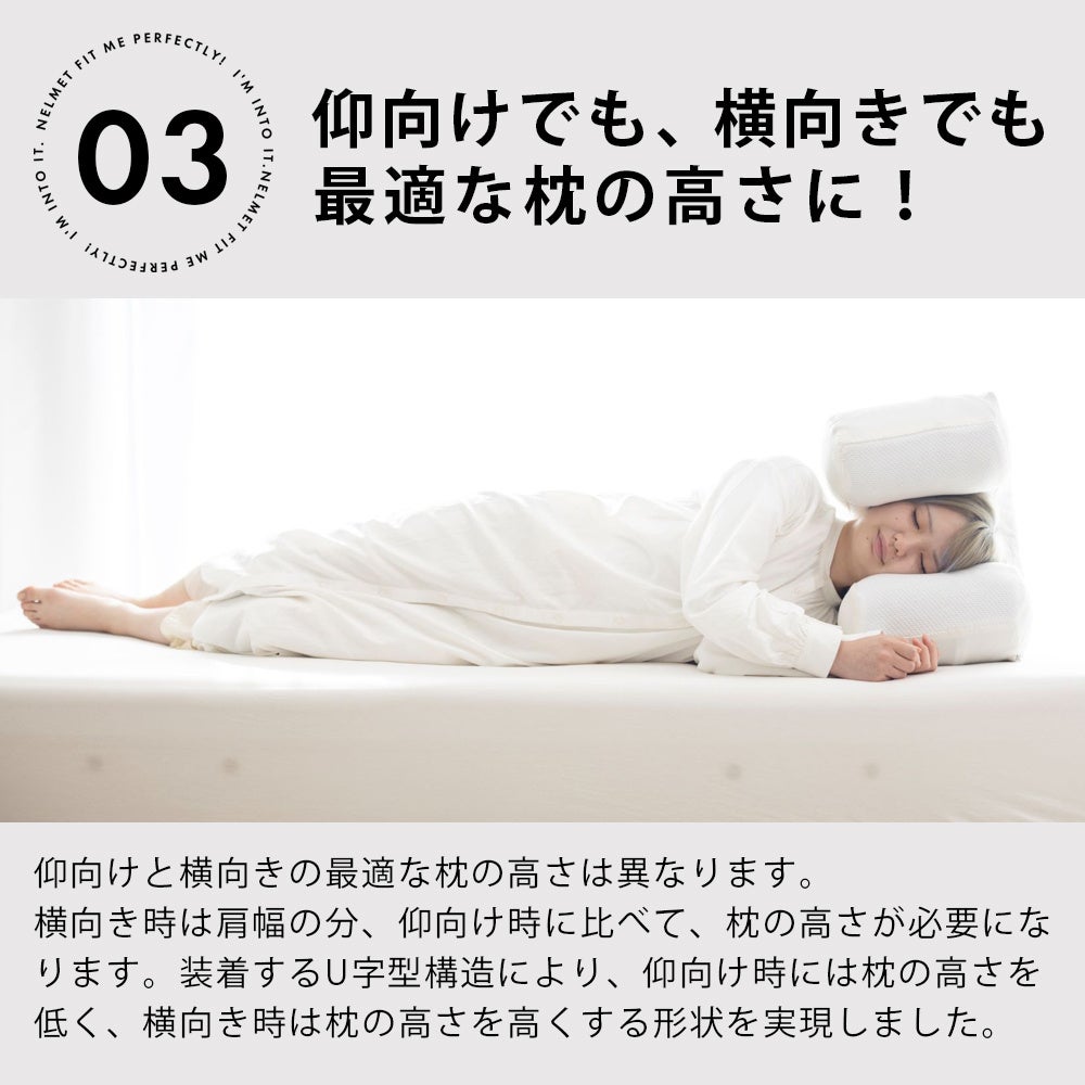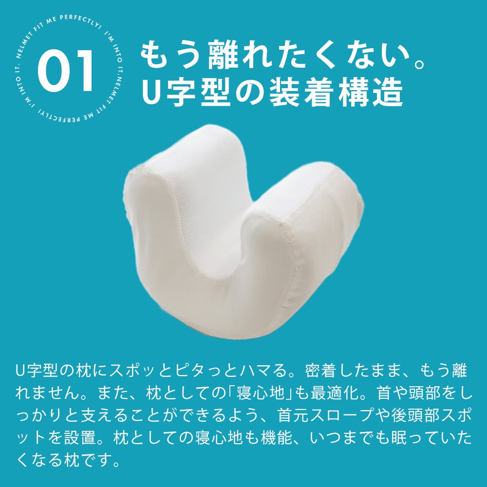 装着するU字型構造により、仰向け時には枕の高さを低く、横向き時は枕の高さを高くする形状を実現しました。