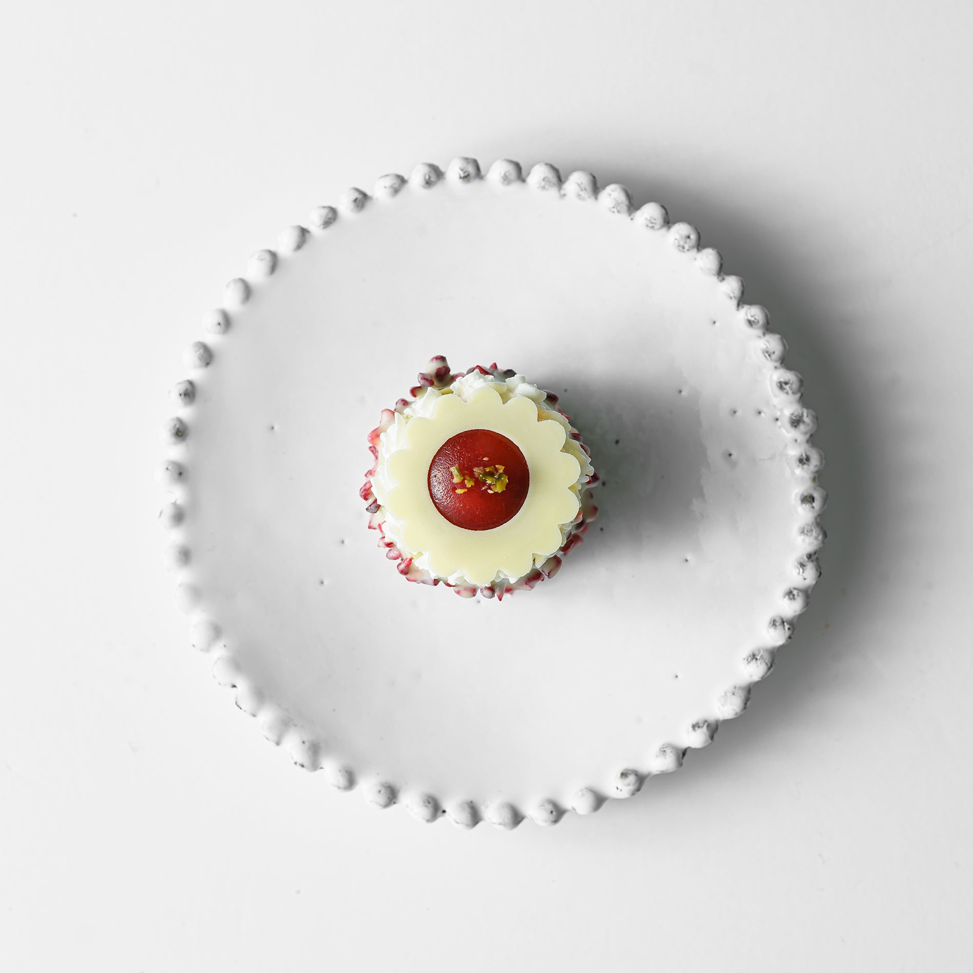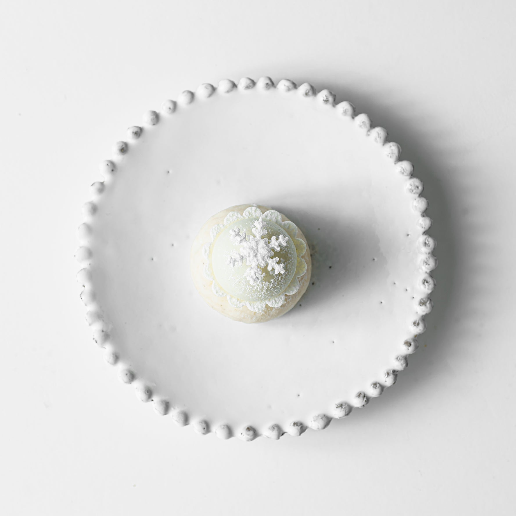 修道女が着るドレスの姿から名付けられたルリジューズ。バニラを主役に、クレームムースリーヌとミルクジャム、ホワイトチョコレートを加えて、香り高いバニラを存分に感じていただけるよう仕立てました。雪だるまのような愛嬌のあるフォルムが目を惹きます。
