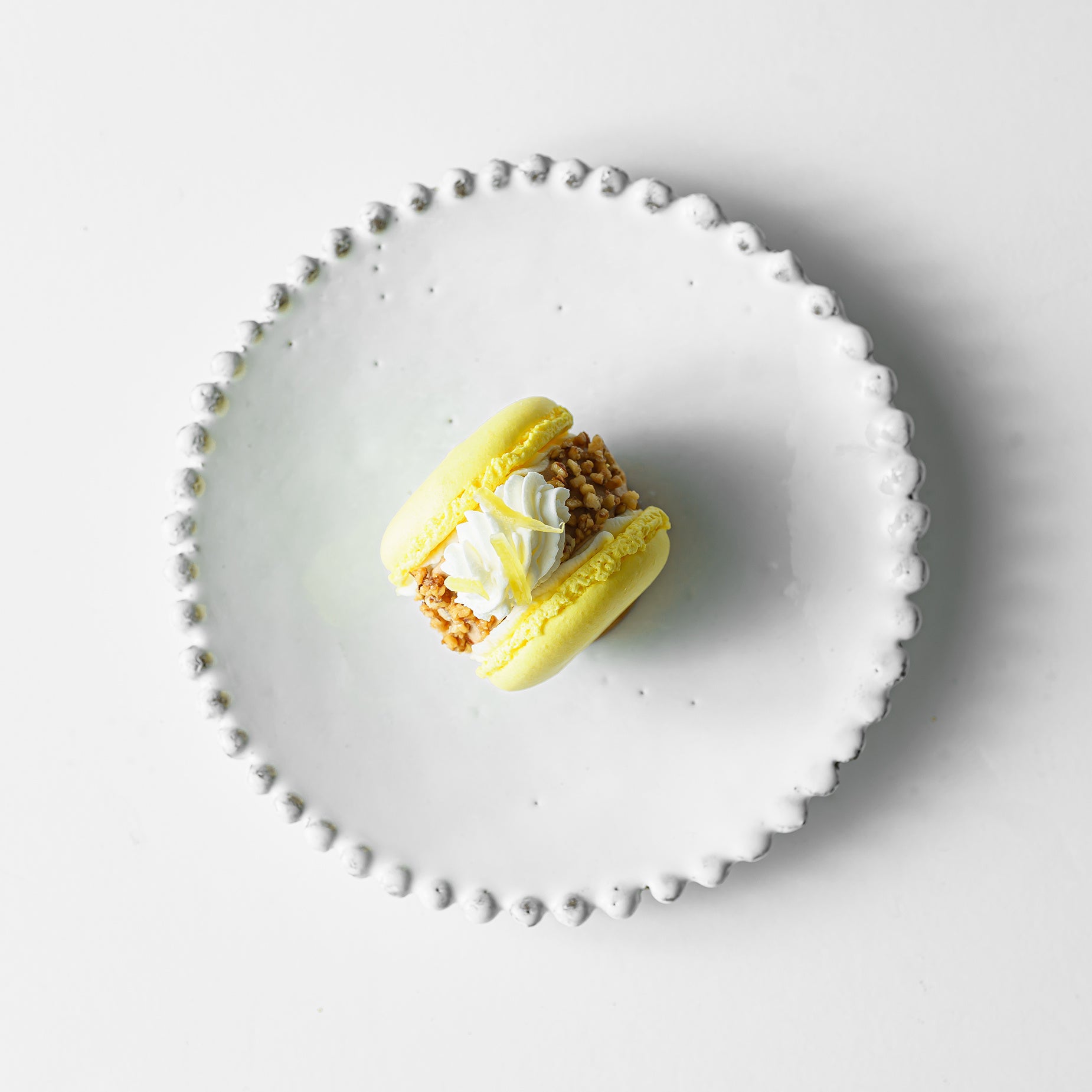 見た目の可愛らしさから広く親しまれているマカロン。洋梨とショコラのムースにベルガモット、カシスの香り、ナッツの食感を忍ばせることで驚きのある味わいに仕立てました。縦に置くことで顕わになる側面の美しさとひときわ目を惹く鮮やかな色彩が、ホリデーシーズンのテーブルを華やかに彩ります。