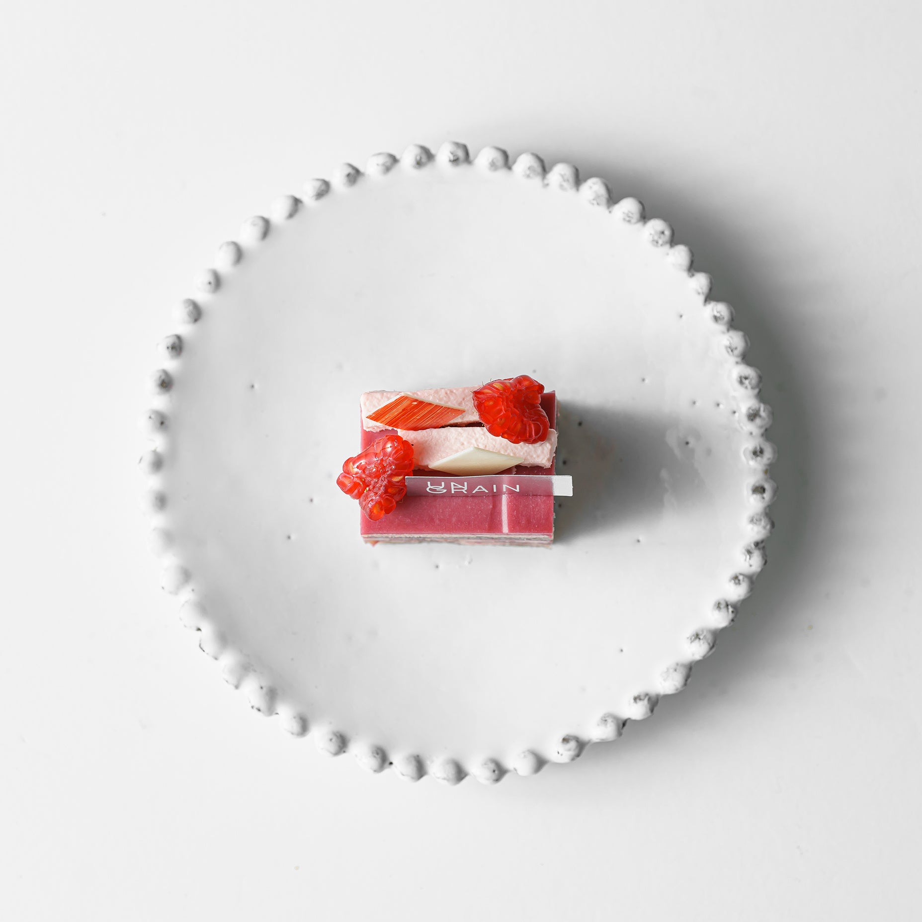 フランス版ショートケーキと称されるフレジエ。苺のフレッシュ感を生の苺を使わずにセンターで表現し、相性の良いピスタチオの濃厚なムースを合わせ、アクセントにピンクペッパーを使用しました。側面に纏わせたフリーズドライのフランボワーズで、食感、見た目のつぶつぶ感を出しています。