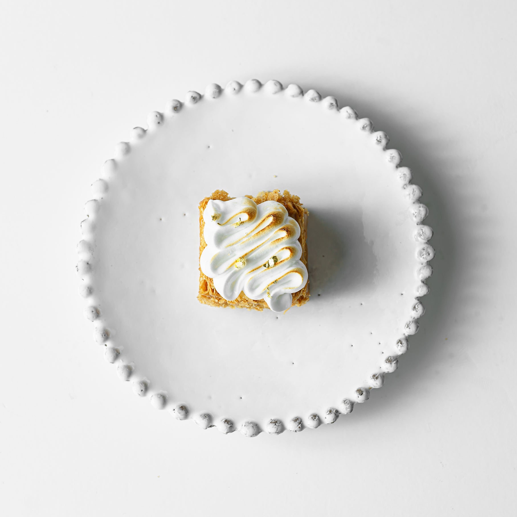 千枚の葉という意味を持つミルフィーユ。プラリネと焼いたイタリアンメレンゲを加え、重ね合わせるフィユタージュ(パイ生地)の厚さを最小限にして、パイの香ばしさを引き立てました。自家製のヘーゼルナッツを使用したプラリネのムースにゆずの風味と酸味を合わせることで、軽さと華やかさを演出しています。