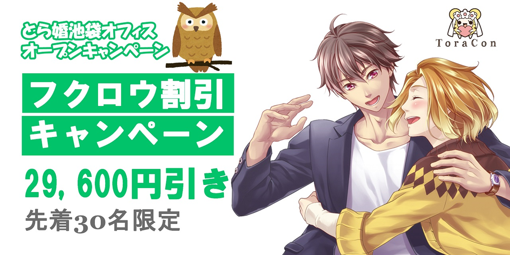 対象:池袋オフィスで「ベーシックプラン」もしくは「プレミアムプラン」にご入会いただいた、契約時点で29歳以下の女性会員様 (「フクロウ割引キャンペーン」との併用可)