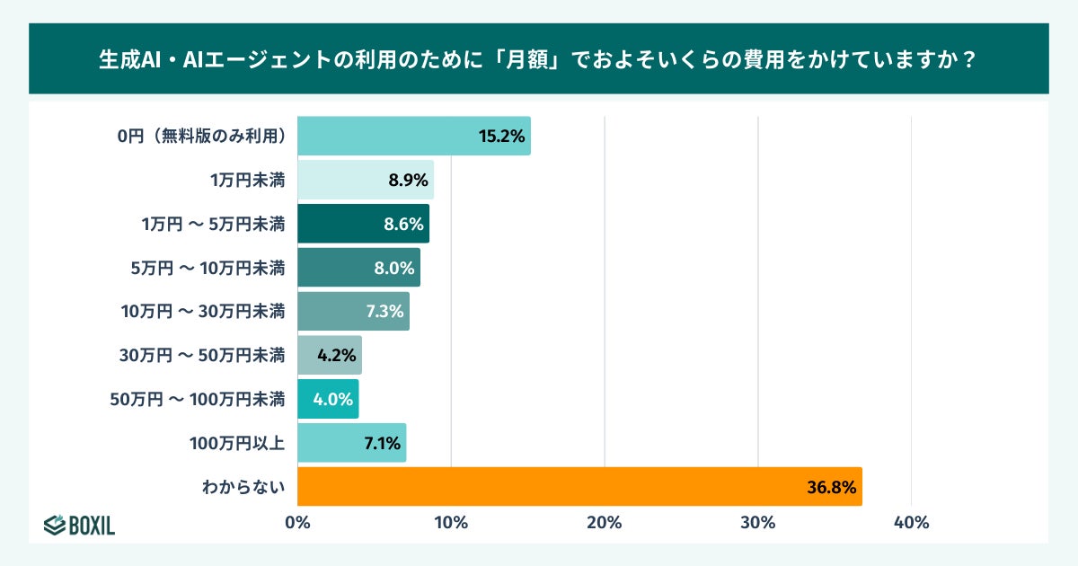 さらに生成AI・AIエージェント利用にかかっている月額費用を尋ねたところ「わからない」(36.8%)が最も多い回答となりました。