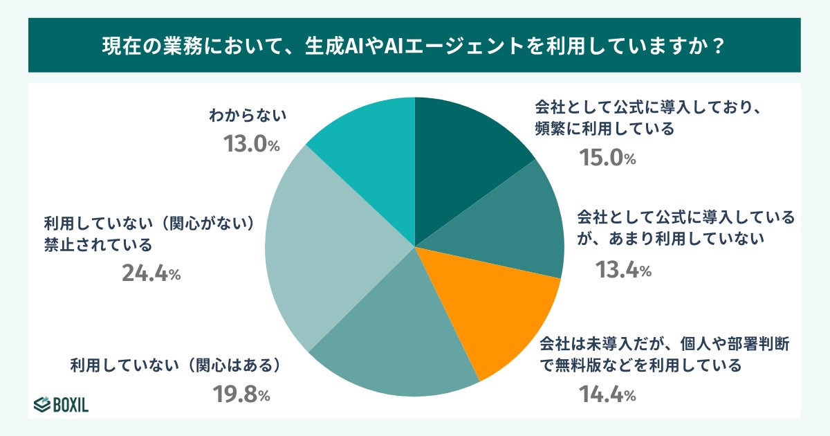 利用者の14.4%が「会社は未導入だが、個人で無料版などを利用している」と回答。公式導入していないにもかかわらず、従業員が独断で業務に利用する「シャドーAI」が蔓延している実態が浮き彫りに