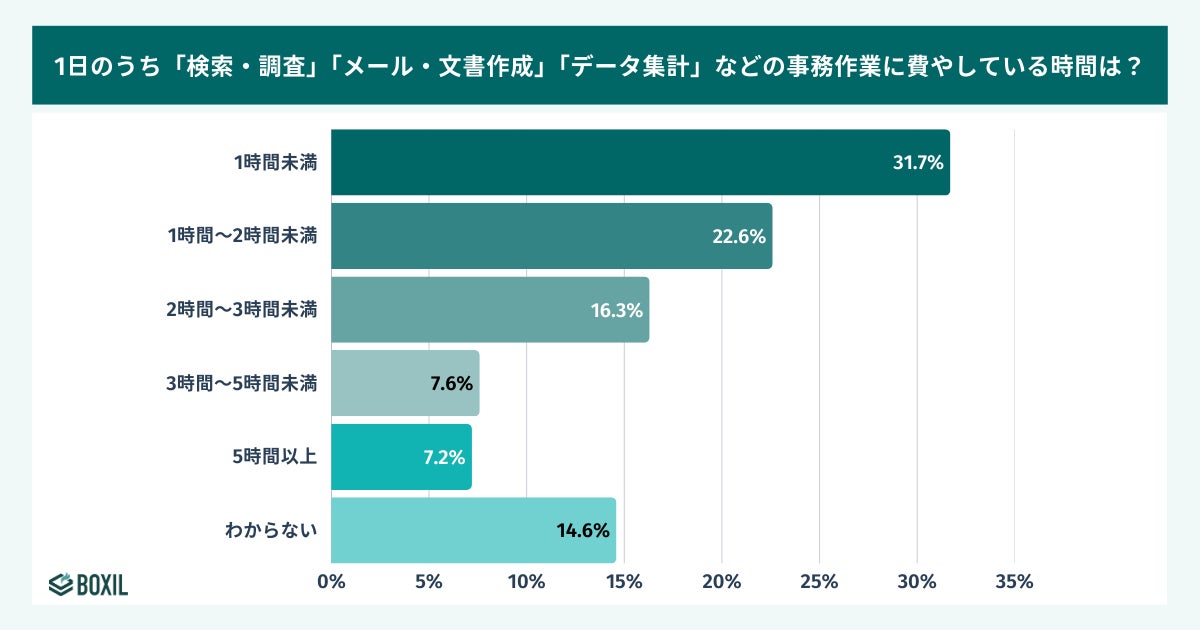 本調査対象者の約3割が1日のうち2時間以上を文書作成などの事務作業に費やしており、個人アカウントでの入力データが生成AIの学習に再利用されるリスクよりも、目の前の効率化を優先せざるを得ない「現場の矛盾」が生じている実態がうかがえます。