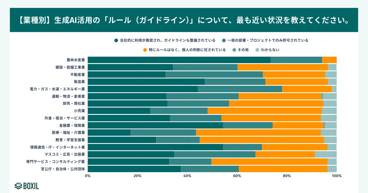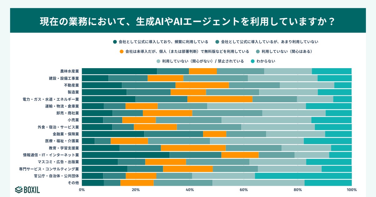 今回の調査では、業種によって「公式導入」と「非公式導入」の差が鮮明に現れました。IT業界などの先行層を除き、特に「個人利用」の割合が公式導入率を上回る、または肉薄している業種が目立ちます。