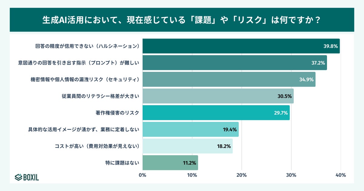 生成AI活用における課題やリスクについて尋ねたところ、利用者が感じているリスクの第3位には「機密情報や個人情報の漏洩リスク」(34.9%)が挙げられました。リスクを認識しながらも利用を続ける背景には、深刻な業務負荷があります。