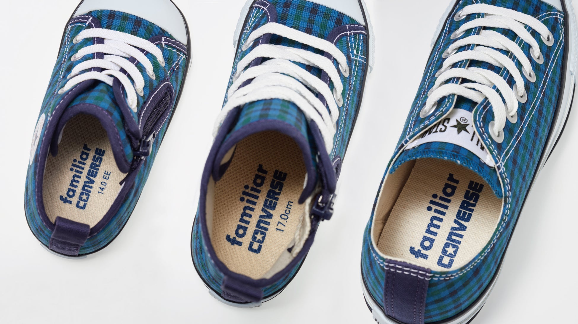 CONVERSE×familiar 大人気コラボ企画第2弾「ALL STAR」に待望の青系ファミリアチェックが登場!根強い人気のカラーを、ベビーから大人まで幅広くサイズ展開