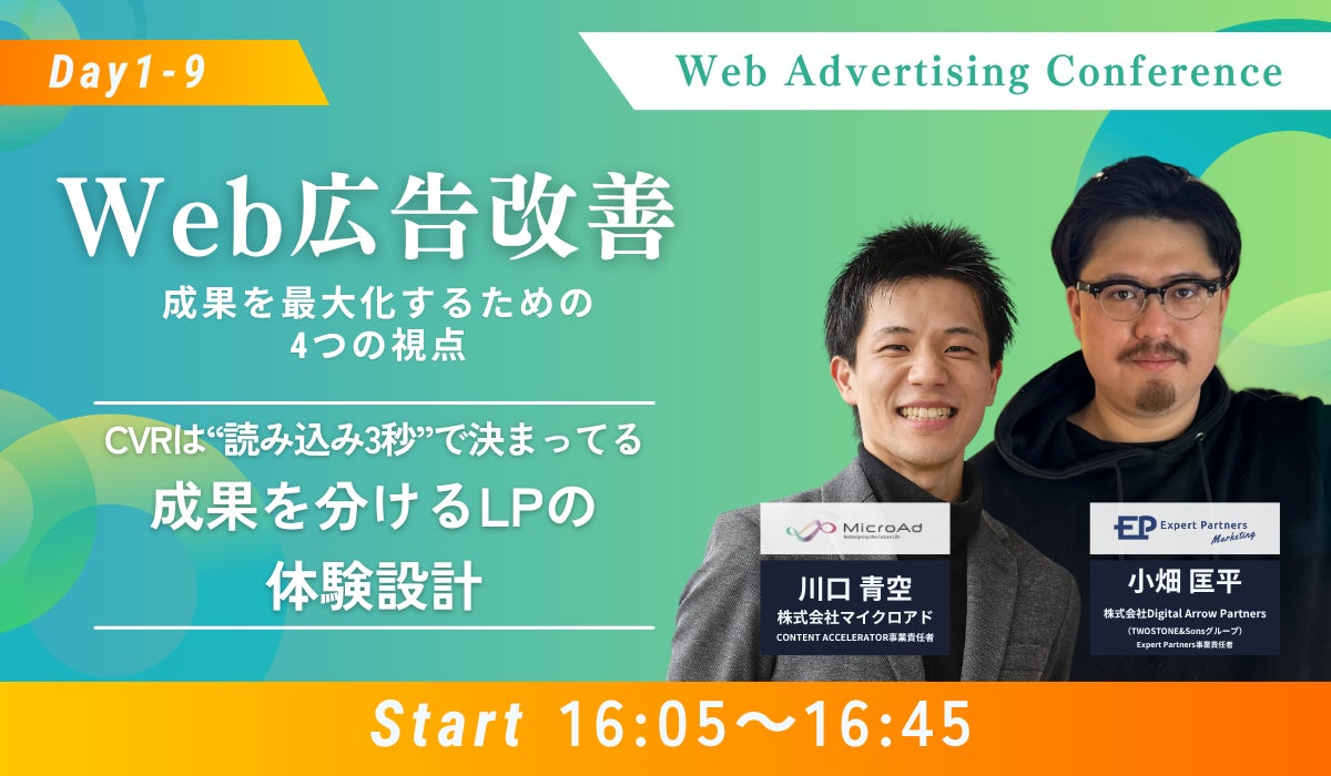 Digital Arrow Partnersが運営する「Expert Partners Marketing」事業責任者が登壇し、「CVRは“読み込み3秒”で決まっている」という視点から、成果を大きく左右するLPの体験設計についてマイクロアドとのセッションにて解説いたします。