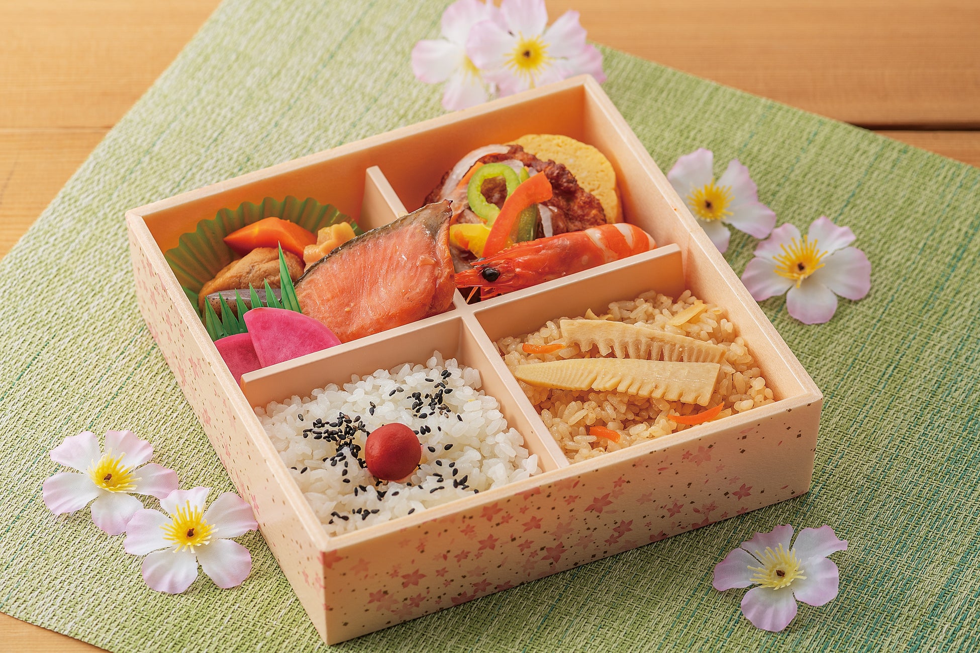 サーモントラウトの西京焼や春を彩る「竹の子ごはん」など,人気のおかずを詰め合わせました。
