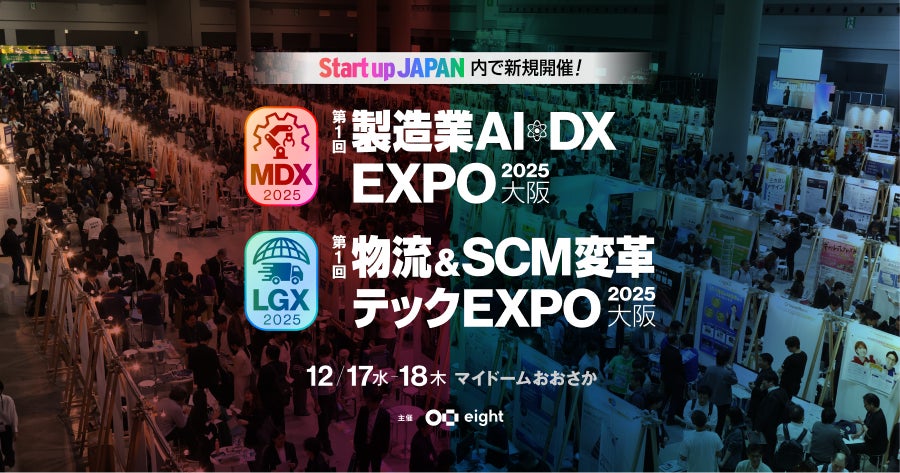 『製造業AI・DX EXPO 2025 in 大阪』は、製造業の変革テックに特化した展示会であり、今回が関西での初開催となります。Sansan株式会社(Eight)が主催し、「Startup JAPAN EXPO 2025 in 大阪」などと同時開催され、製造業のDX推進責任者や工場長、SCM担当者など約12,000名の来場が見込まれています。