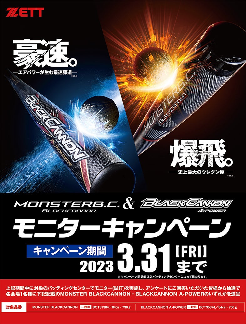 「ベースボールを科学する。」ゼット株式会社(本社/⼤阪市天王寺区、代表取締役社⻑/渡辺裕之)は、高機能軟式バット2023年モデル【MONSTER B.C(モンスターブラックキャノン)】と【BLACKCANNON A-POWER(ブラックキャノンAパワー)】の発売にともない、モニターキャンペーンを全国28箇所のバッティングセンターで好評実施中です。