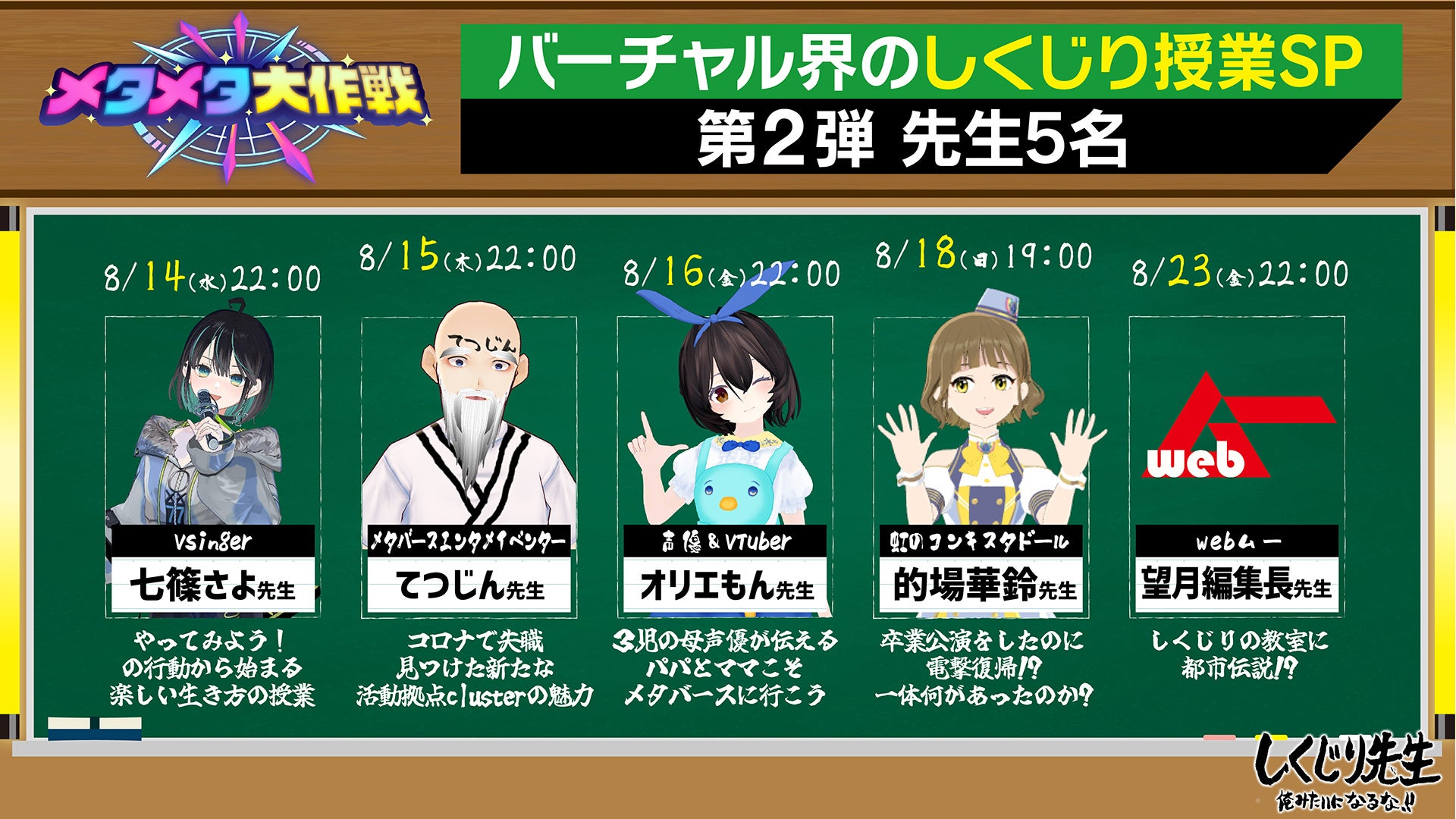 メタバース界のしくじり授業SP後半戦も8月14日(水)22時からスタート!バーチャルシンガーからプリキュア声優、イベンター、さらに現役アイドル虹のコンキスタドール的場華鈴、グランドフィナーレは特別編「webムー」編集長登場!