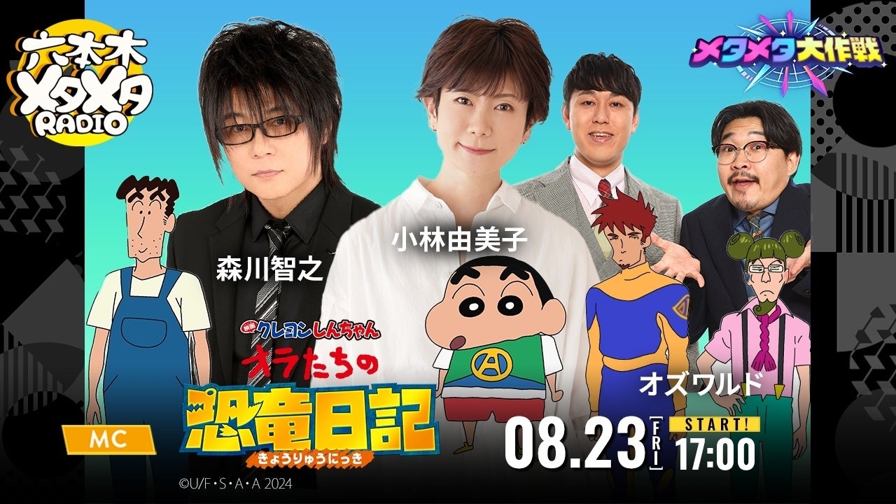 8月23日(金)17時から『映画クレヨンしんちゃん オラたちの恐竜日記』の公開を記念し、「クレヨンしんちゃんコラボSP」として小林 由美子(しんのすけ役)、森川 智之(野原ひろし役)、さらに今回の映画でゲスト声優を努めたお笑いコンビ オズワルド(伊藤俊介、畠中悠)が出演が決定。