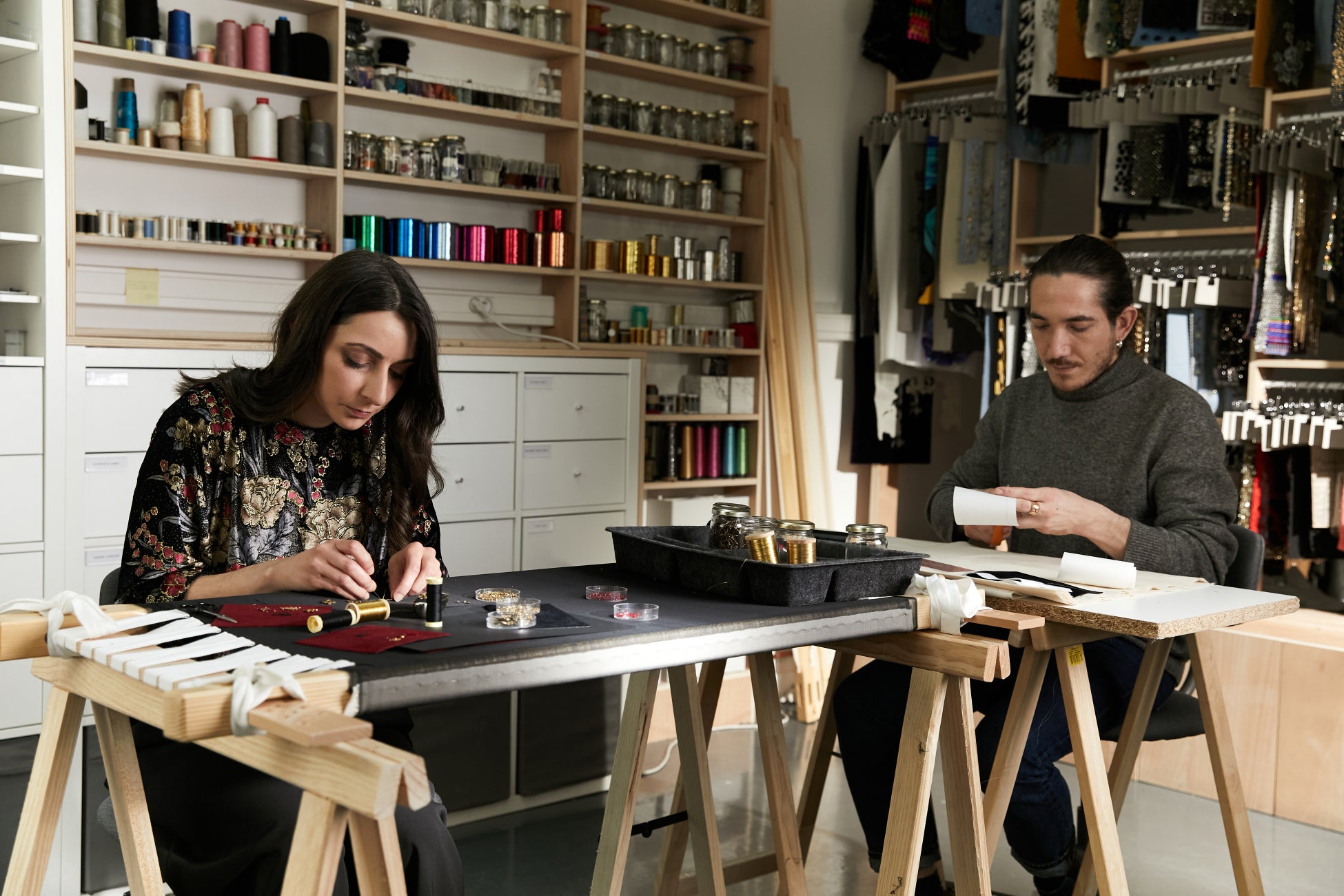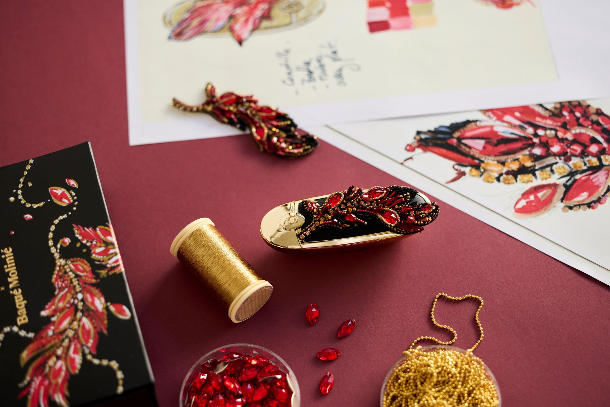 無比の才能と注目すべき数々のコラボレーションにより、オートクチュールの世界で名声を集める同スタジオが生み出したのは、マットブラックのエレガントなケース。ゴールドのチェーンと煌めくレッドのビーズが絡み合う羽の刺繍をあしらった、比類なきジュエルケースが誕生します。このケースは、〈ルージュ ジェ〉が打ち出した3種のアイコニックなシェードと共に限定セットとして登場します。