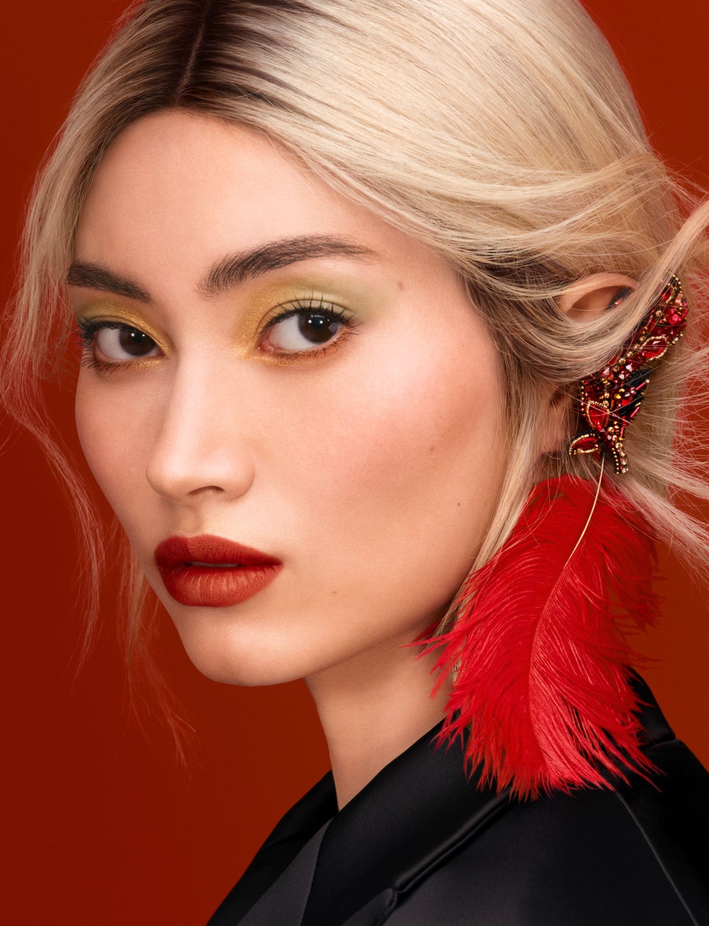 ふわりと揺れる金髪をなびかせながら、目もとに〈オンブル ジェ 870 エメラルド フェザー〉のハーモニーを纏っています。唇を彩るのは〈ルージュ ジェ ラグジュリアス ヴェルヴェット555 ブリック アンブル〉。耳もとを飾っているのは、刺繍スタジオ「バケ モリネ」がデザインした、雄大な鳥の寓話