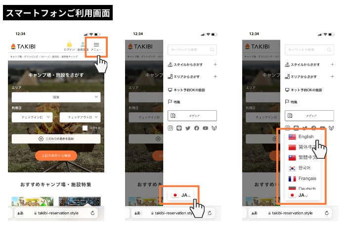 世界的なパンデミックの影響で長らくインバウンド観光が停滞する状況が続いておりましたが、昨今のアフターコロナのインバウンド需要拡大を受け、「TAKIBI」のサイト機能として、新たに9言語に切り替え可能な翻訳機能を追加いたしました。