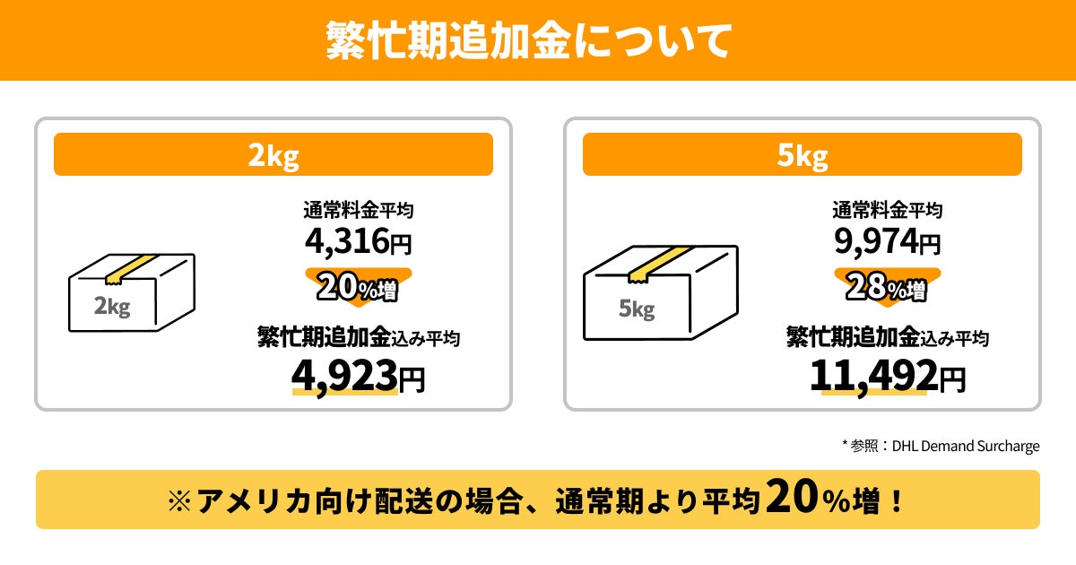 越境EC市場においても、配送の需要過多による人件費の高騰、コンテナ不足や燃料費高騰などの影響を受けて、配送キャリア各社で 繁忙期追加金の措置を行い、各配送キャリアでは通常時よりも平均20%程度(*アメリカエリアへの配送、DHL価格参照)の配送料金の追加がアナウンスされています。