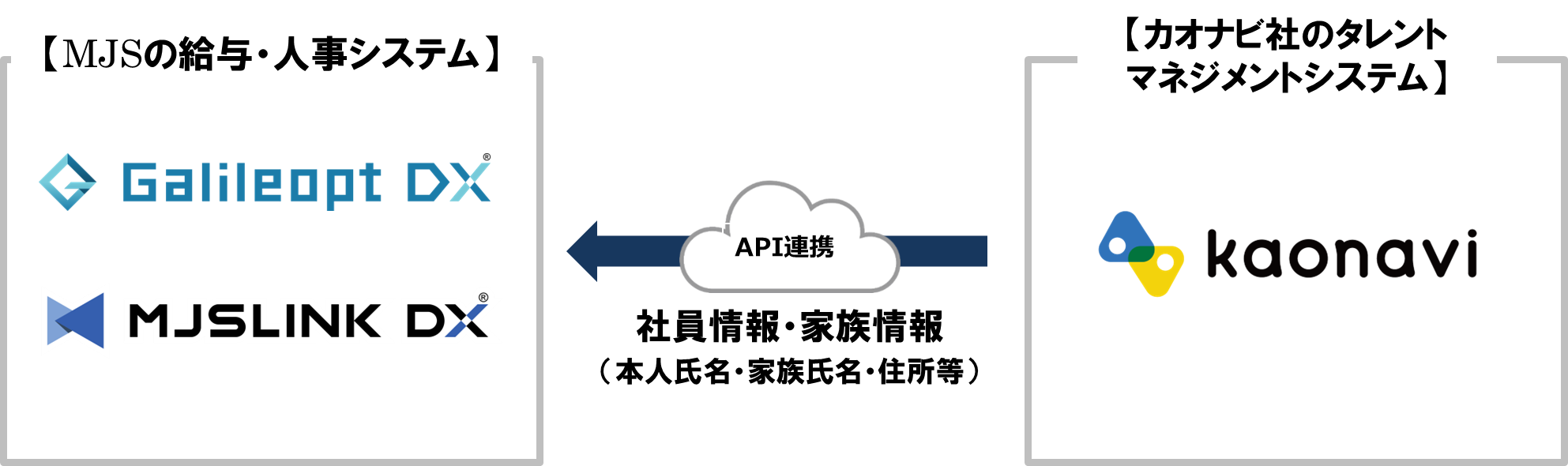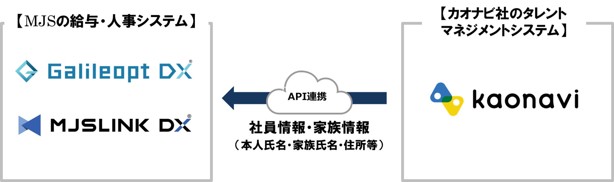 今回のAPI連携により、『カオナビ』に登録された社員情報・家族情報を、『Galileopt DX 給与大将・人事大将』『MJSLINK DX 給与大将・人事大将』にワンクリックで自動連携することができます。
