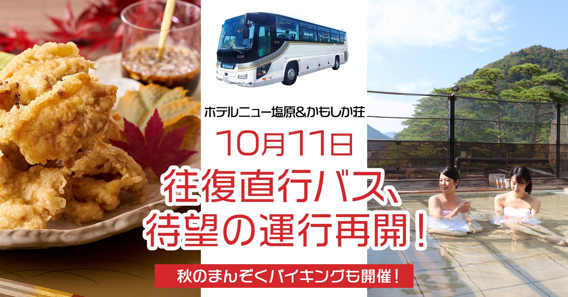 大江戸温泉物語 塩原温泉「ホテルニュー塩原」「かもしか荘」の秋は話題満載。9月1日、秋のまんぞくバイキングスタート!10月11日、待望の「往復直行バス」運行再開!