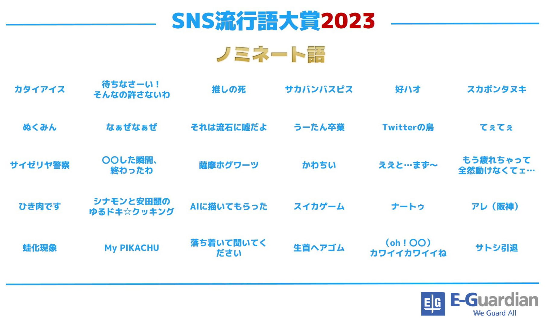 イー・ガーディアンは、安心・安全なインターネット環境の実現に向け、投稿監視、ソーシャルリスニング、ネットパトロール、カスタマーサポート、デバッグ、脆弱性診断などネットセキュリティに関わるサービスを一気通貫で提供しております。日々のソーシャルリスニングで蓄積したデータをベースに、イー・ガーディアンが今年X(旧Twitter)上で広くつぶやかれたワードを独自で調査し、その年に最も多く投稿された(バズった)ワードを決める「SNS流行語大賞」、2023年度は上記の30ワードがノミネートされました。