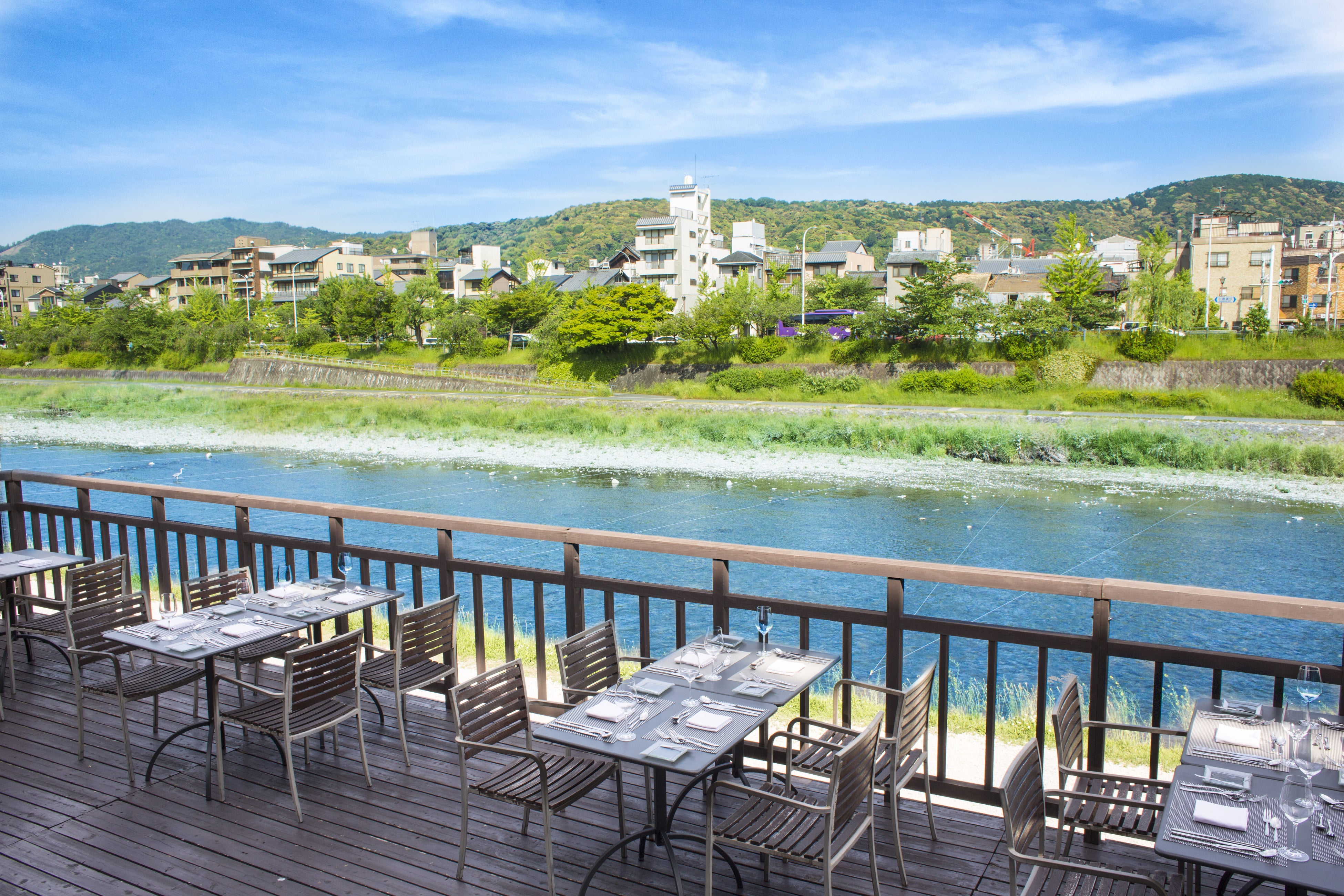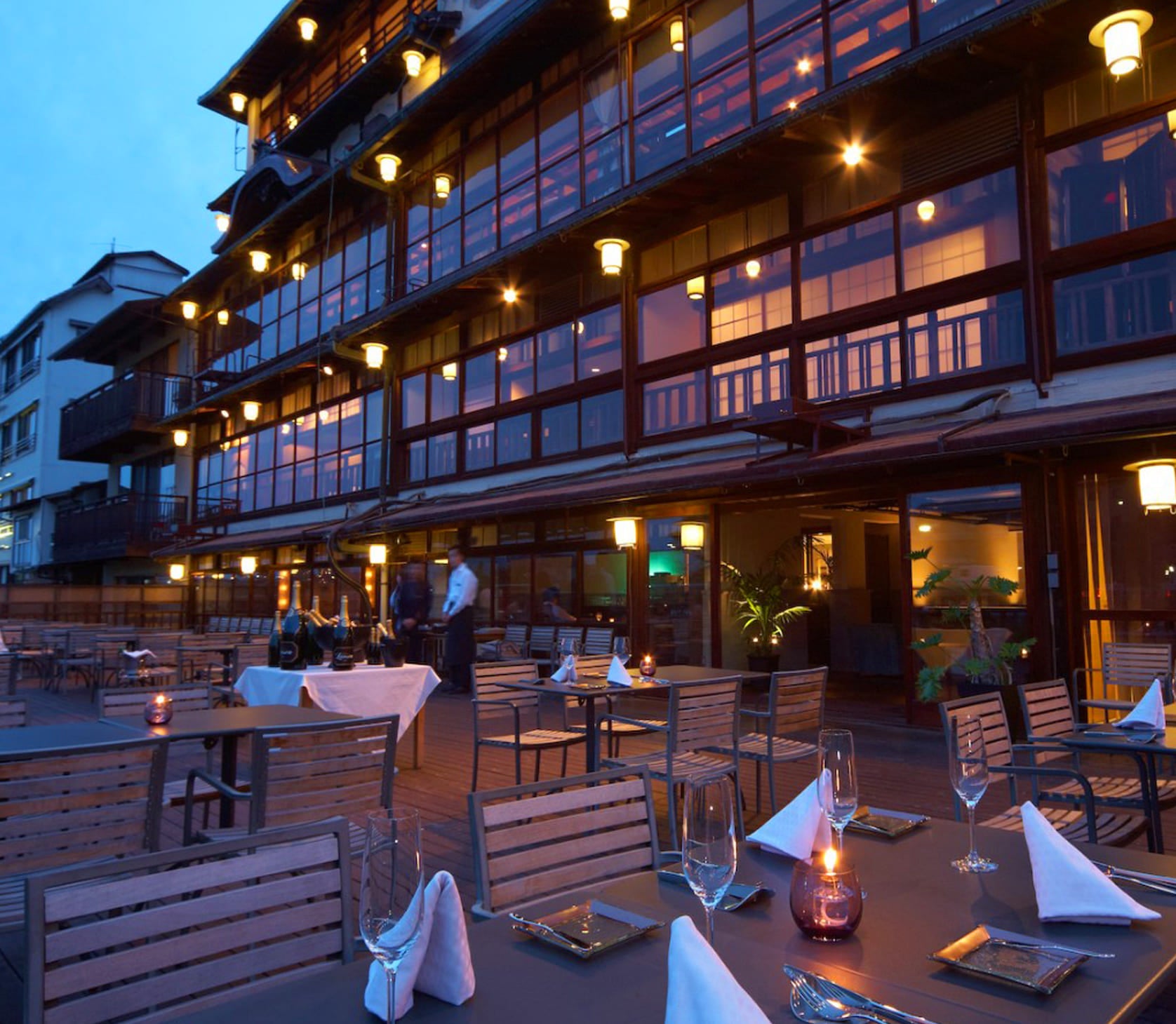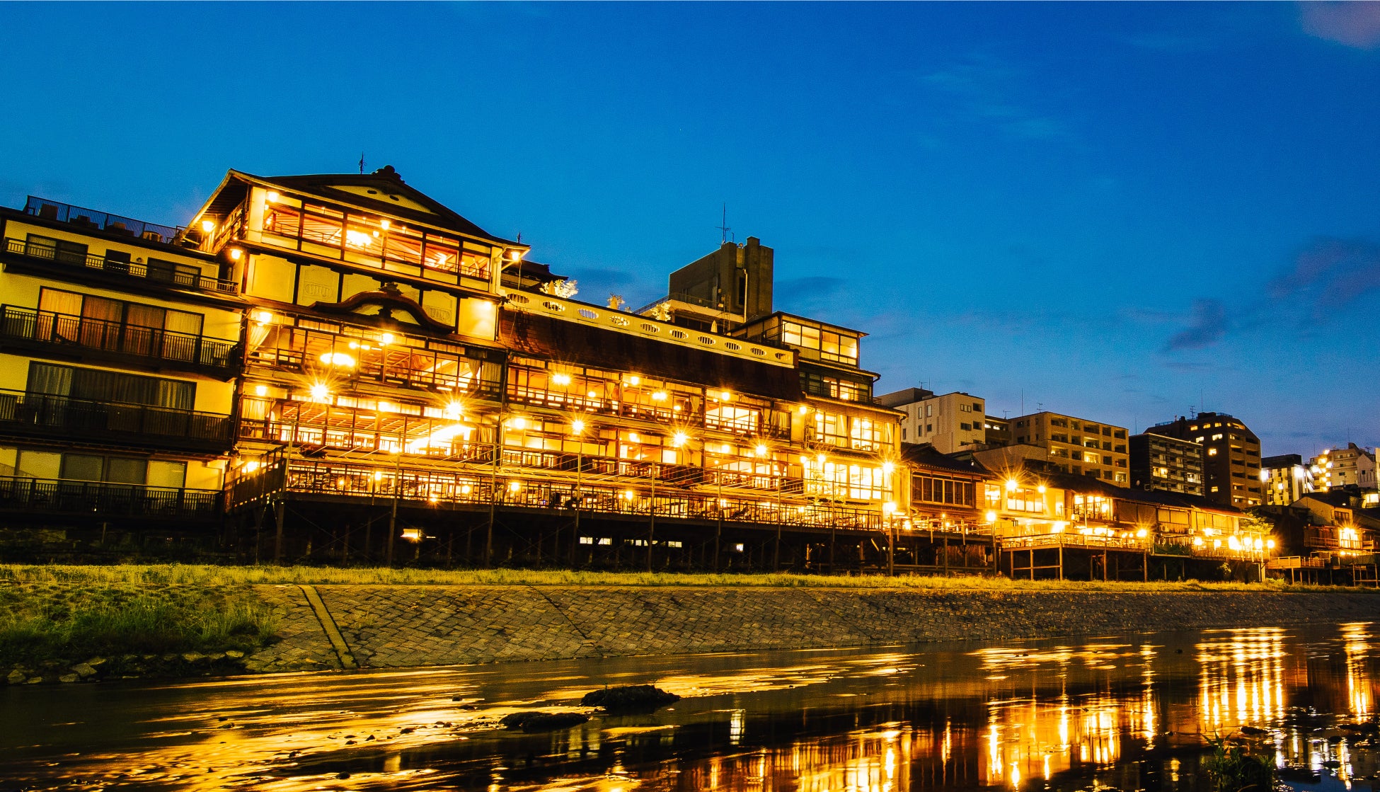 川床は京都では夏の風物詩として知られ、鮒鶴京都鴨川リゾートの川床は鴨川沿い最大規模の床面積を誇ります。目の前を流れる鴨川と遠くの東山の眺望からは、京都の四季がありありと伝わります。唯一無二の非日常空間で、ぜひ京都らしさに溢れた格別の一日をゲストと共にお過ごしください。