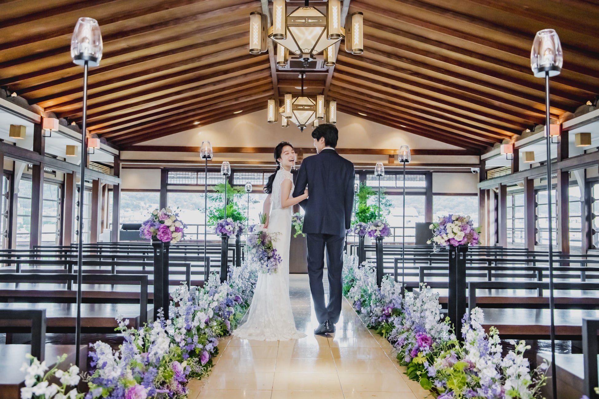 京都を代表する老舗が立ち並ぶ木屋町通で、ひと際目を引く鮒鶴京都鴨川リゾート。かつて「鮒鶴」の名で料理旅館として愛されてきた築100年を超す純和風建築を、往時の趣を残しながらもリノベートした歴史あるユニークべニューです。その歴史性と見る人を圧倒する高い芸術性から、2012年には国の登録有形文化財にも登録されています。鮒鶴京都鴨川リゾートではそんな歴史を紡いできた空間が織りなす伝統的な世界観のなかで、新郎新婦、そしてゲストの「時」を結ぶクラシックウェディングを提供しています。