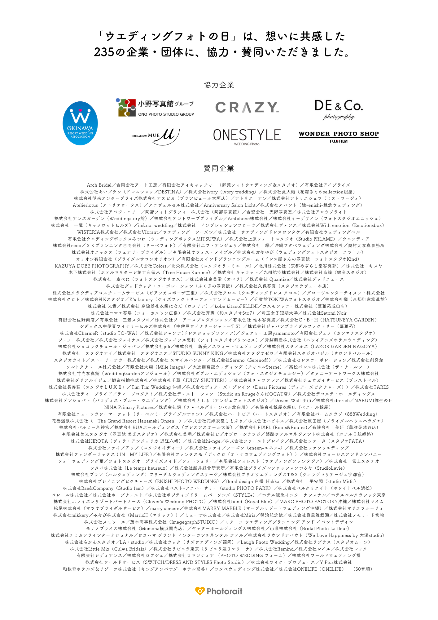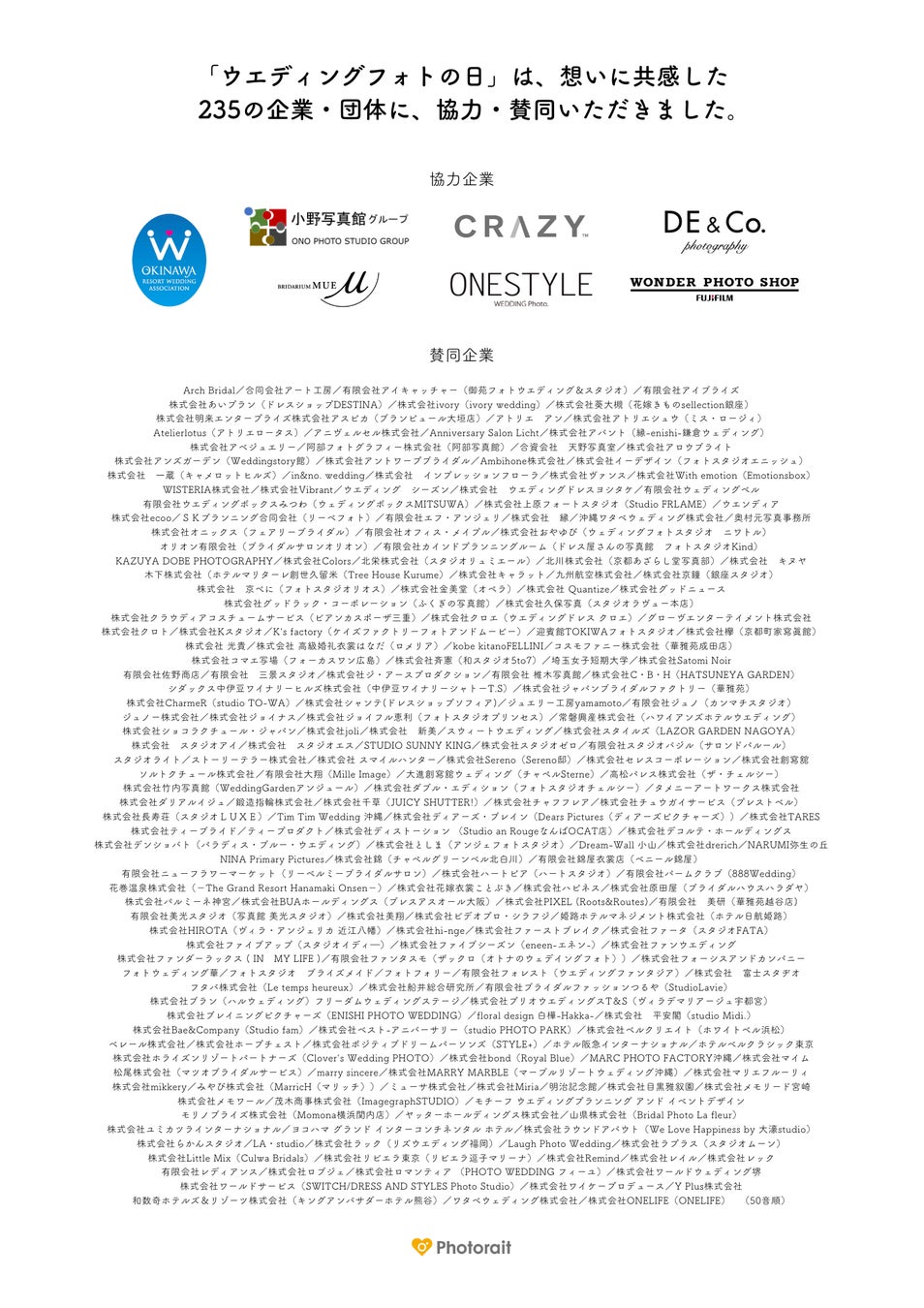 「ウエディングフォトの日」は、7の企業・団体の協力、228の企業・団体の賛同、合計235の企業・団体の、本プロジェクトの想いに賛同し皆様とともにつくるプロジェクトです。