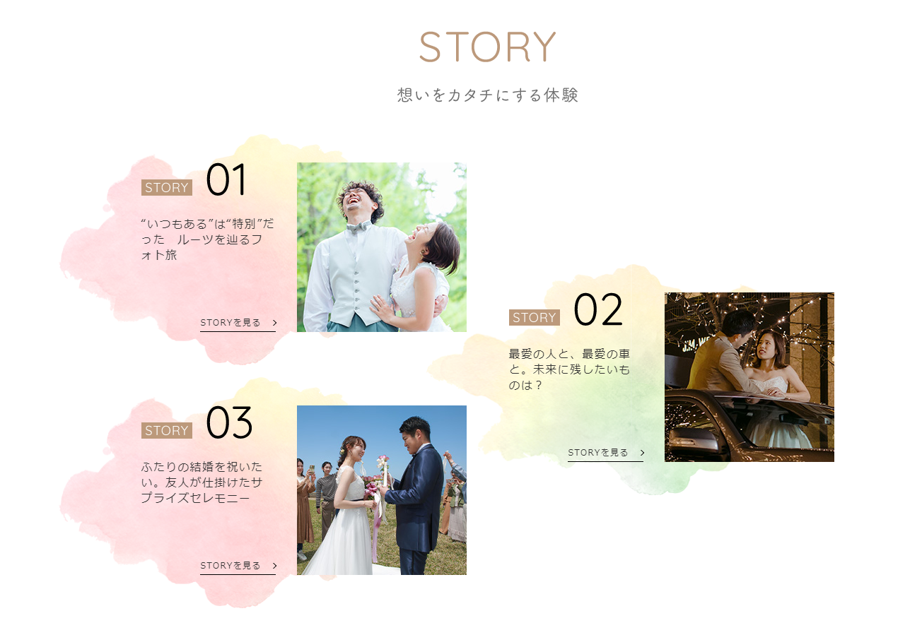 「#特別な瞬間をずっと続く幸せに」をコンセプトとした、ウエディングフォトを撮影した方のストーリーを紹介するコンテンツやキャンペーン、賛同企業の紹介などを行う特設ページです。撮影した方のエピソードは、今後も追加を予定しております。