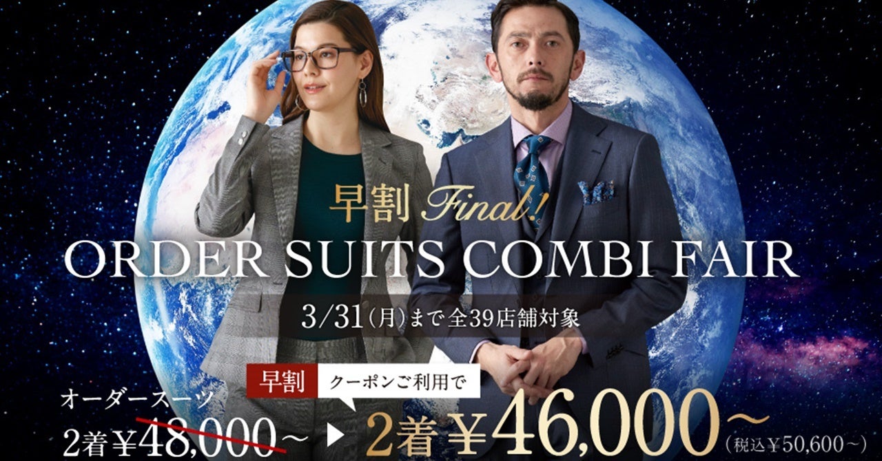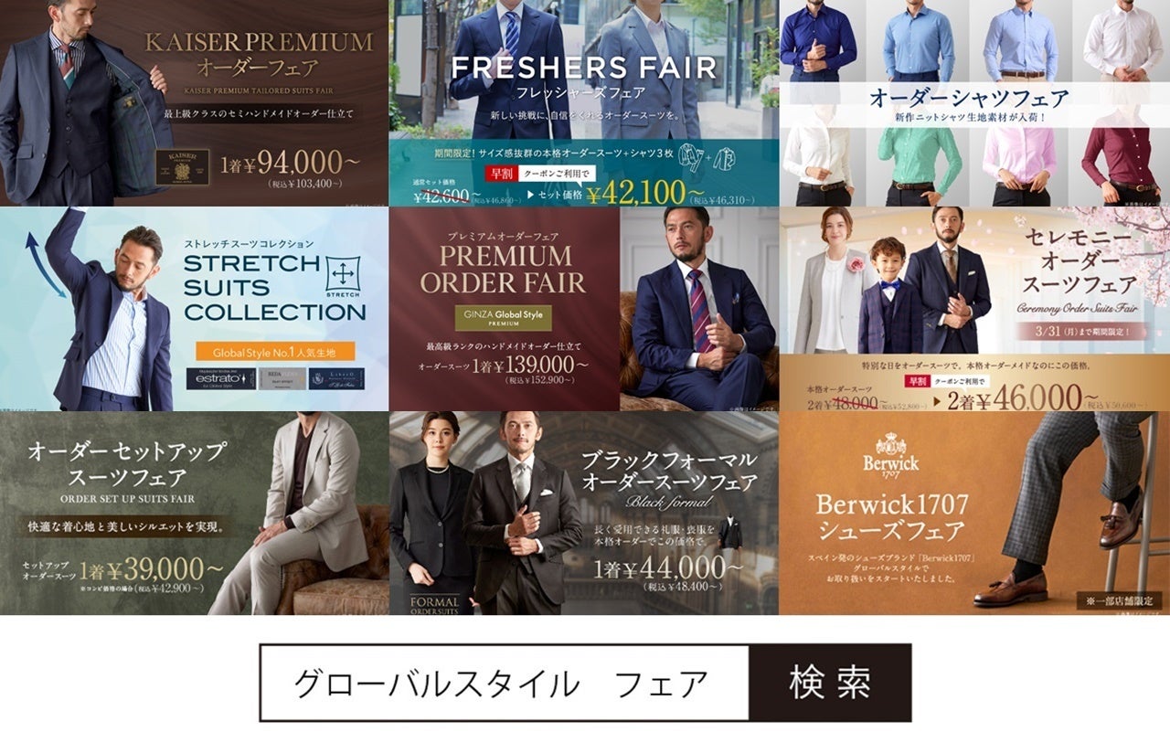 【早割Final!】グローバルスタイルがお得なフェアを3月3日~3月31日まで全店舗で開催!対象プランのご利用でオーダースーツ2着¥46,000~(税込¥50,600~)+配送サービス割引クーポン