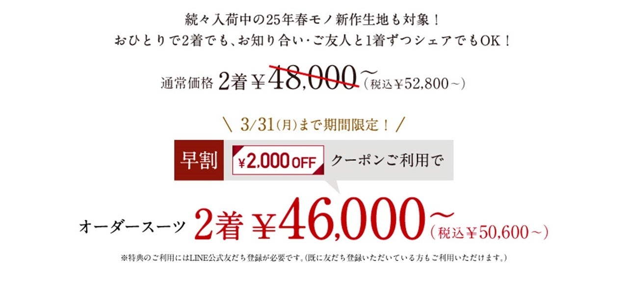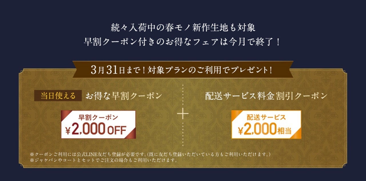 オーダースーツ専門店「グローバルスタイル」を運営するグローバルスタイル株式会社(東京証券取引所 スタンダード市場:7126、本社:大阪市中央区、代表取締役社長 田城弘志)は、3月3日 (月)から3月31日(月)までの期間中、対象プランのご利用で、オーダースーツがお得になる『2,000円分早割クーポン』+『配送サービス2,000円分割引クーポン』をプレゼントするフェアを全39店舗で開催いたします。