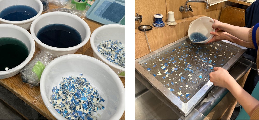 東京日本橋に拠点を構え、和紙漉きの工房をもつ老舗和紙専門店「小津和紙」にご協力いただき、制作のサポートやデザインのノウハウを教えていただきながら手漉きの和紙を作り上げました。制作には、和紙に用いる代表的な自然素材である楮(こうぞ)をベースに、壁紙のサンプルを細かく粉砕したチップを混ぜ込みました。チップは粒度や色のバリエーションをいくつか用意し、最終的にバランスの良いデザインを採用しています。