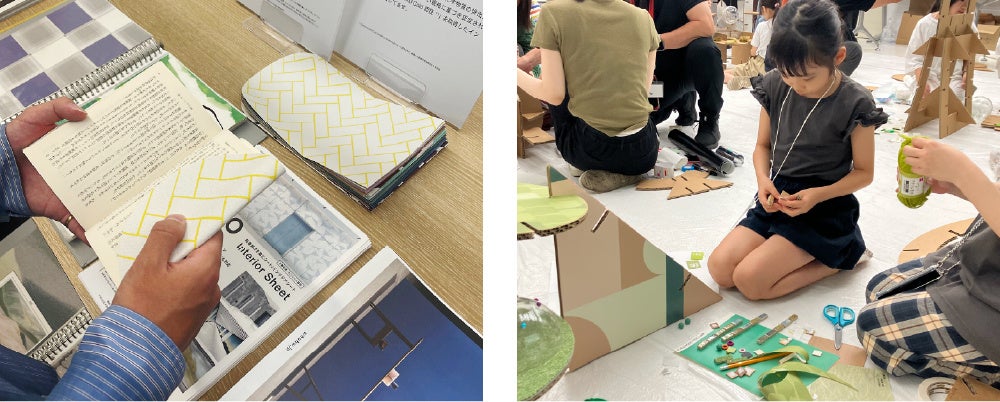 これまでにも、展示会の来場者へ廃棄予定の壁紙で作成したブックカバーをノベルティとして配布したり、一般社団法人 日本空間デザイン協会主催のこども空間ワークショップ「デザインがっこう」にて使用する材料の一部として、廃棄予定だったサンプルを提供。近くには、資材ロスをアウトレット価格で販売する企業への提供も検討しています。今後もなるべく廃棄物がでないよう、活用の機会を積極的に検討していきます。