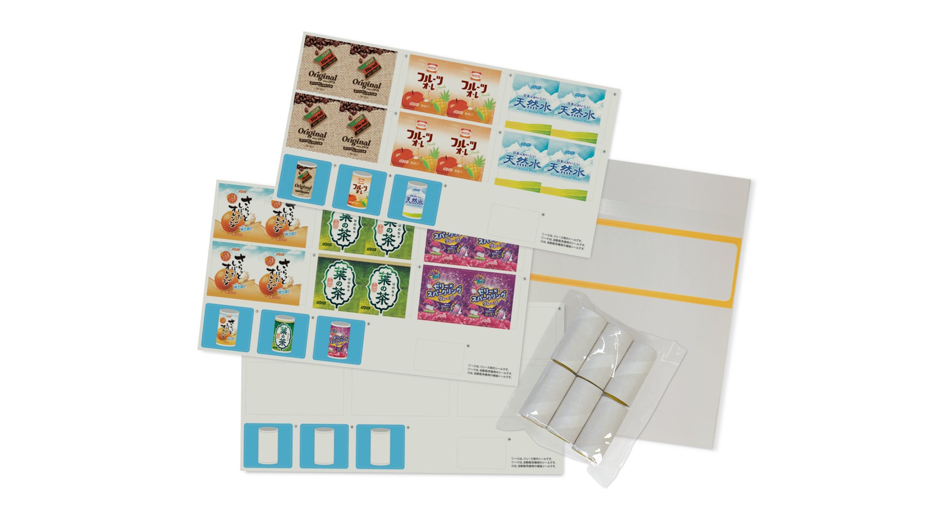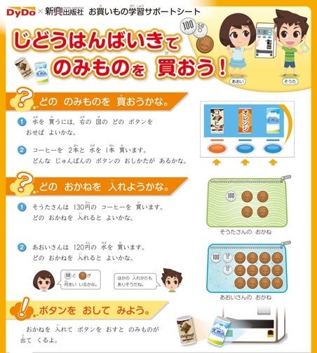 提供先から「買いもの学習に活用できる」というご意見を参考に、教科書や参考書などを数多く出版されている新興出版社啓林館監修のもと、ダイドーの工作自動販売機を活用した「お買いもの学習サポートシート」を同梱しております。