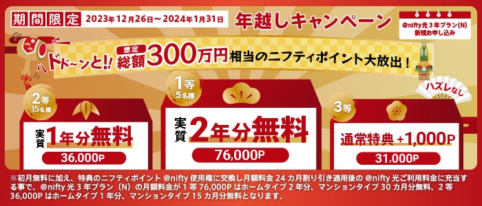 ニフティ、1等実質2年分無料のニフティポイントが抽選で当たる!「年越しキャンペーン」を実施~ドド~ンと想定総額300万円相当のニフティポイント大放出!~